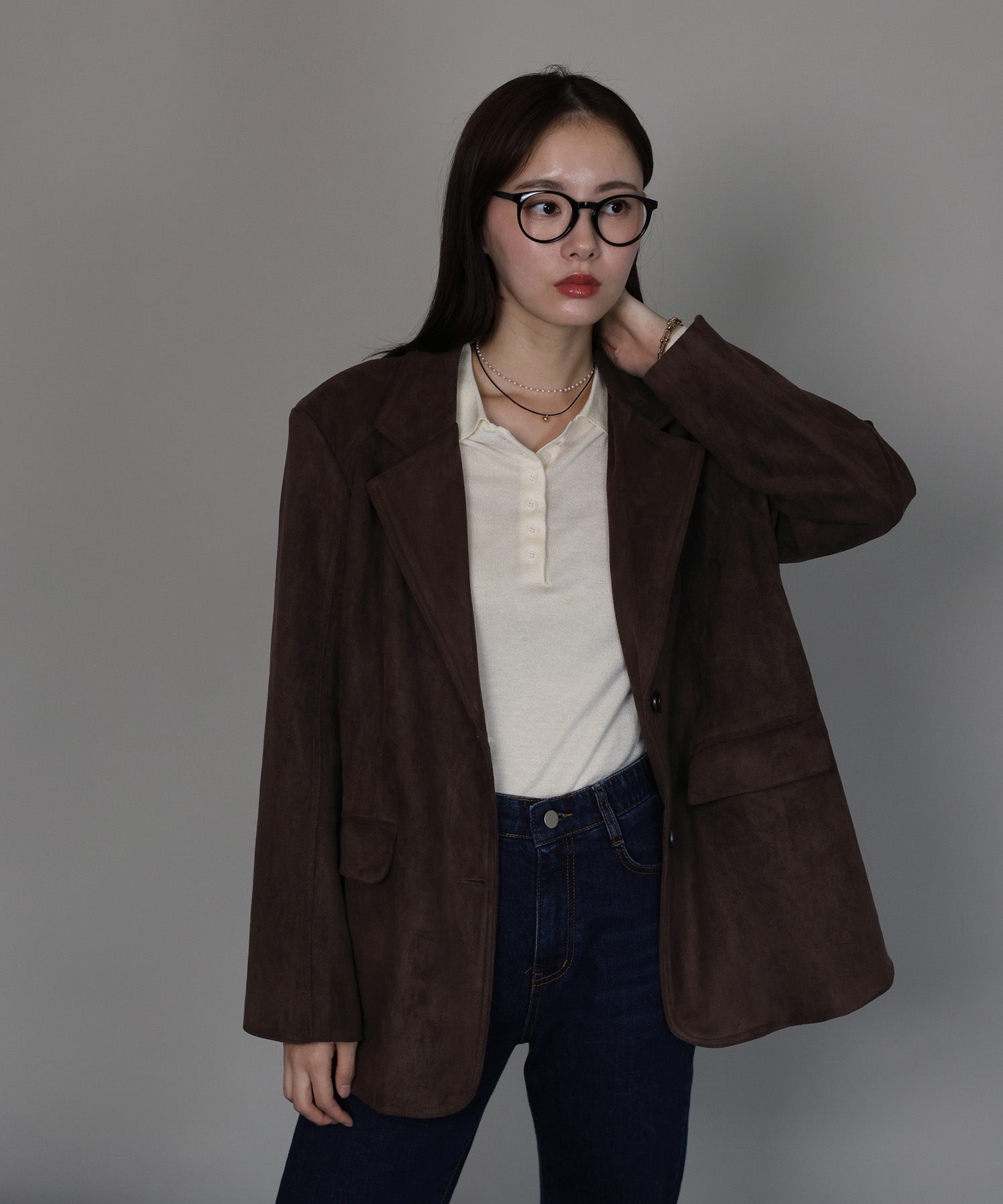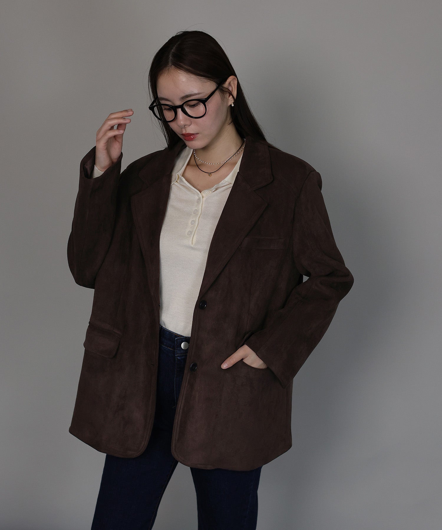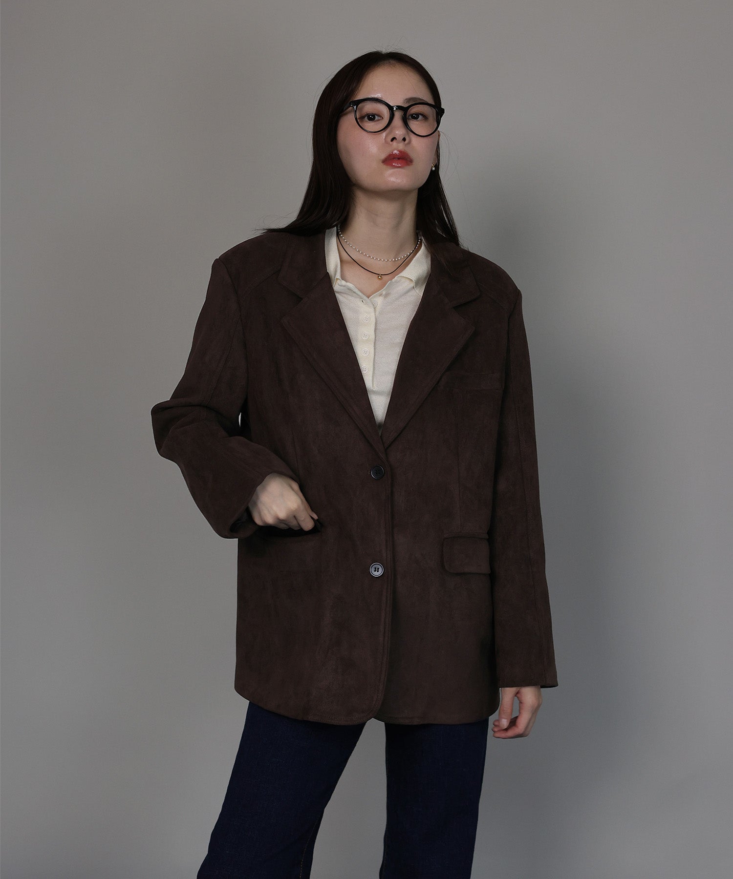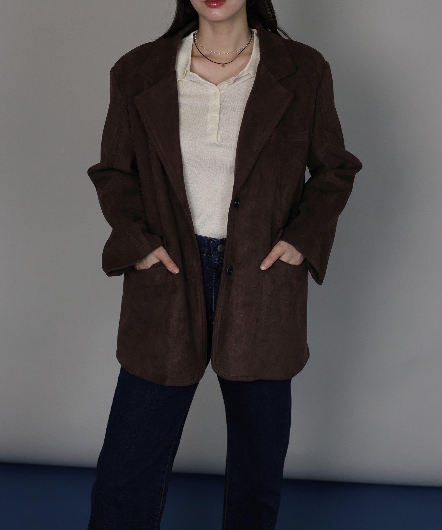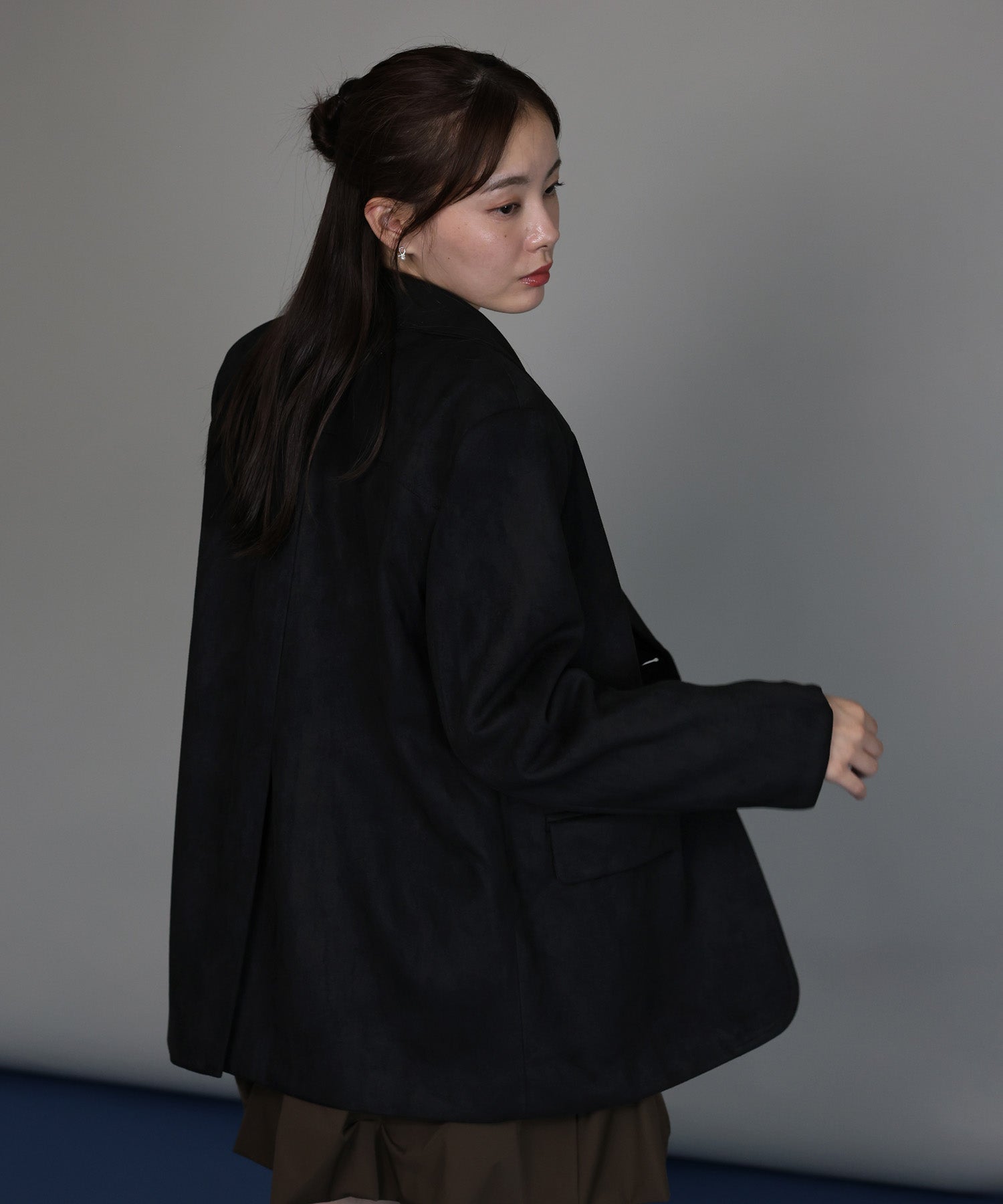 厚みとハリのあるスウェード生地が上品な存在感を放つテーラードジャケット。