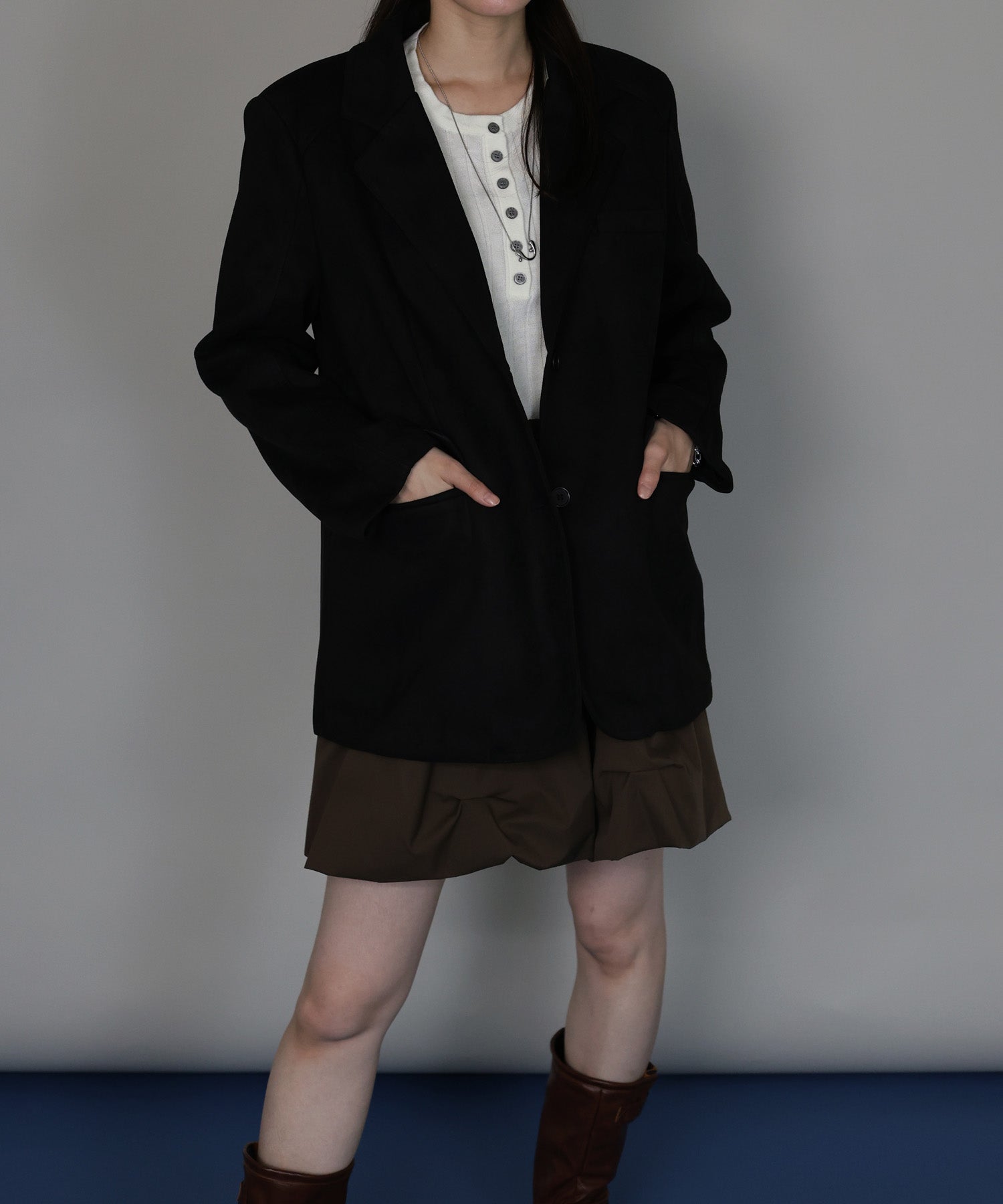 ややオーバーなシルエットで、羽織るだけでこなれ感を演出。