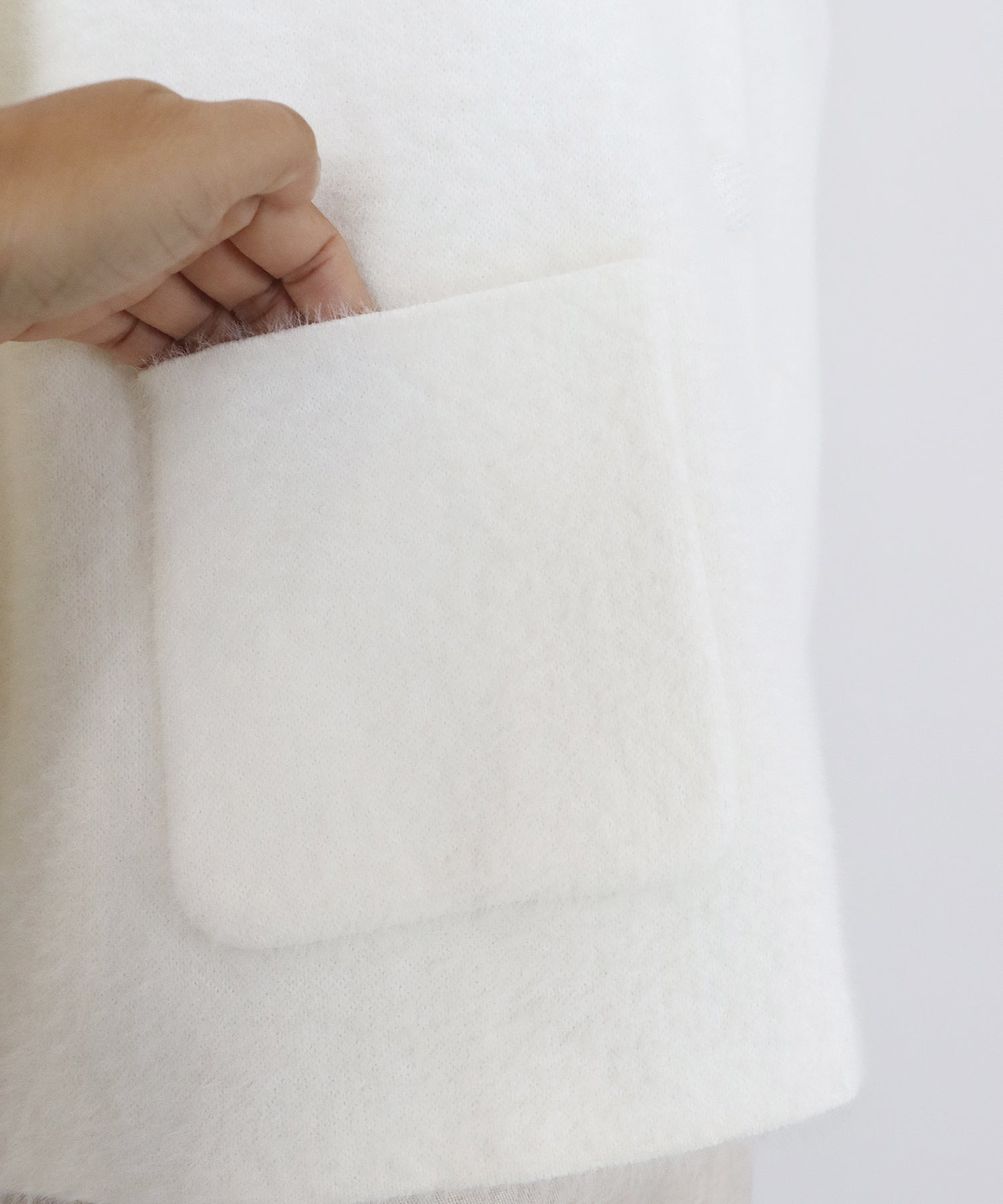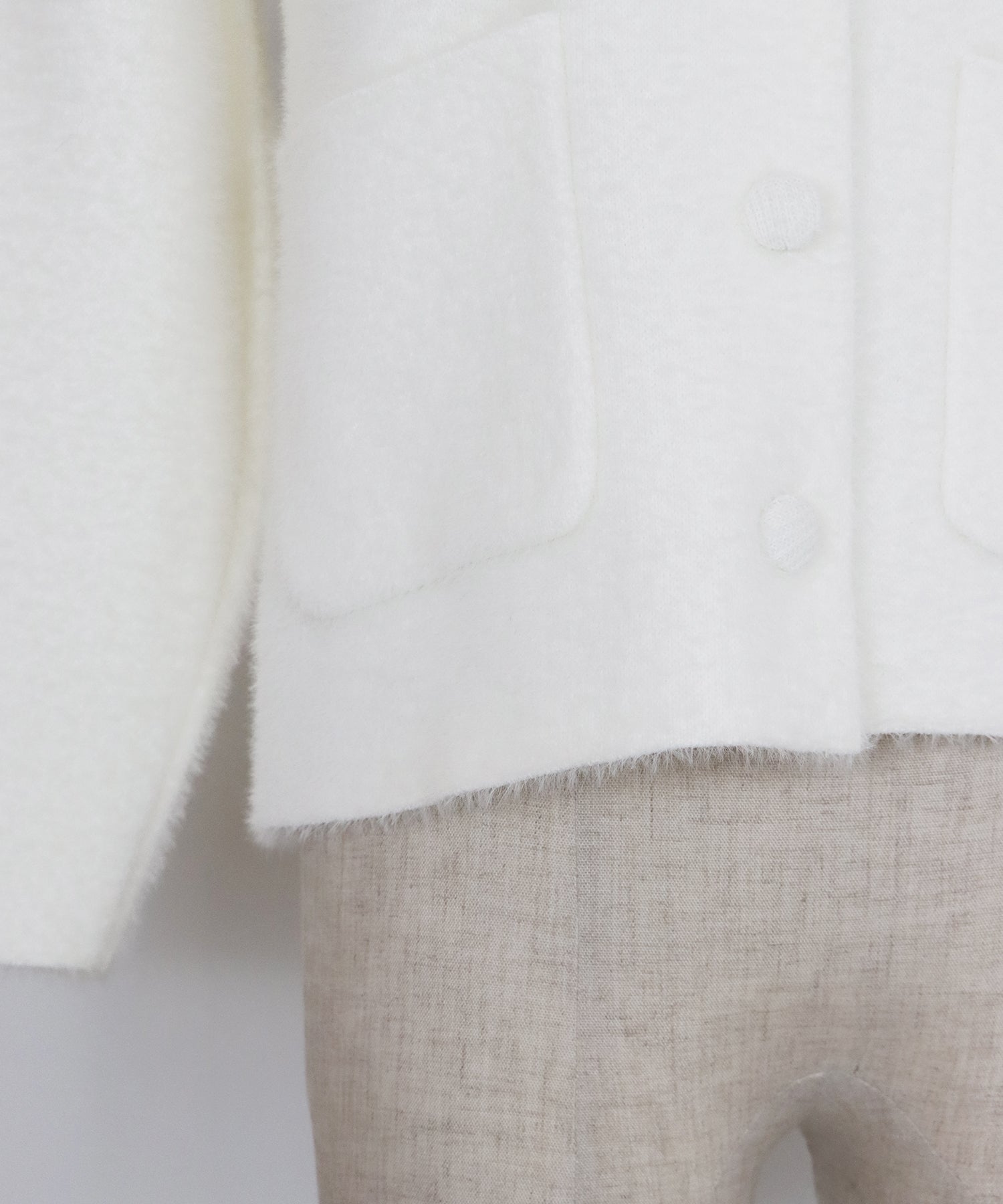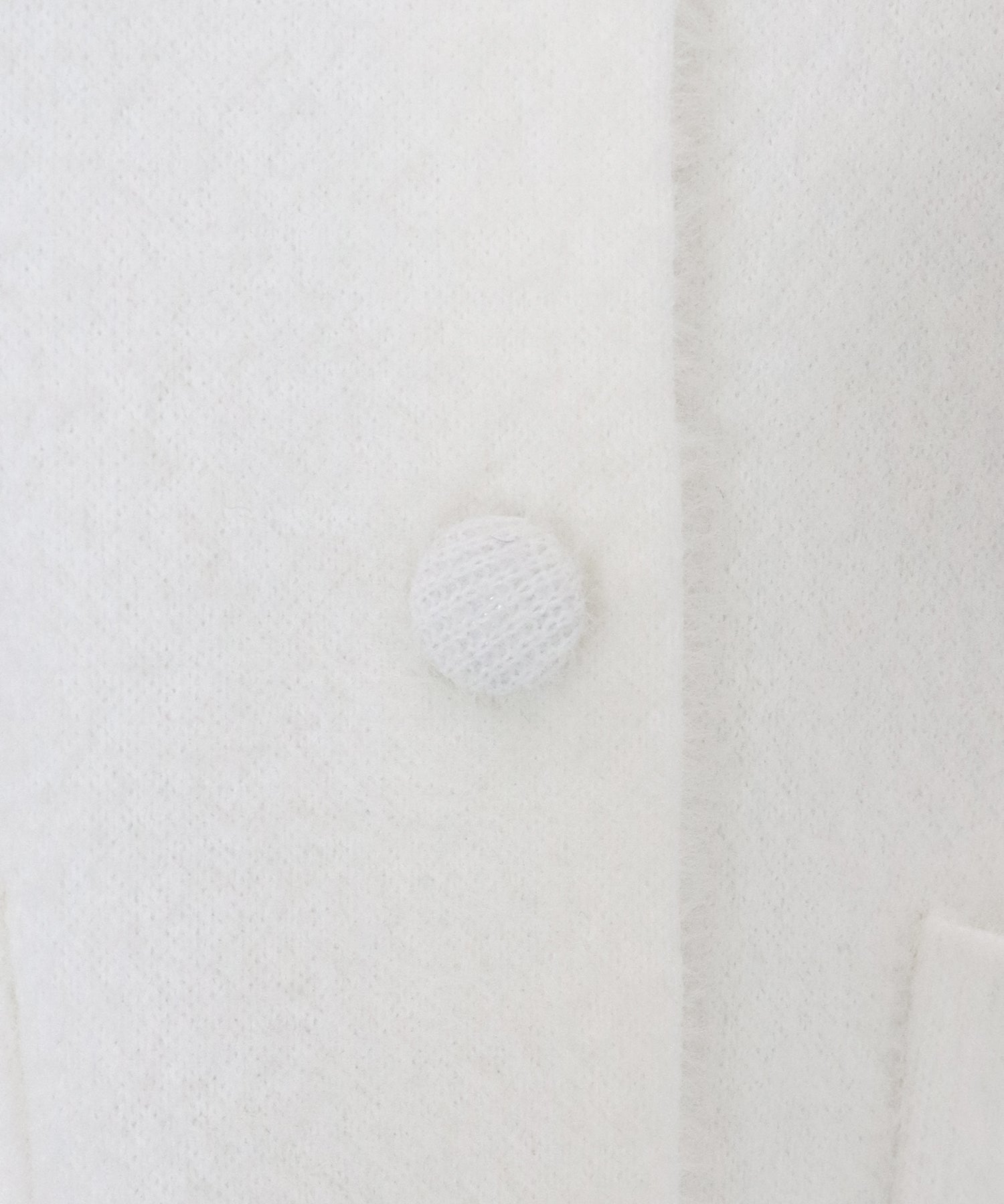 シャギーニットのきれいめなジャケットにツイード素材の包みボタンをあしらい、
