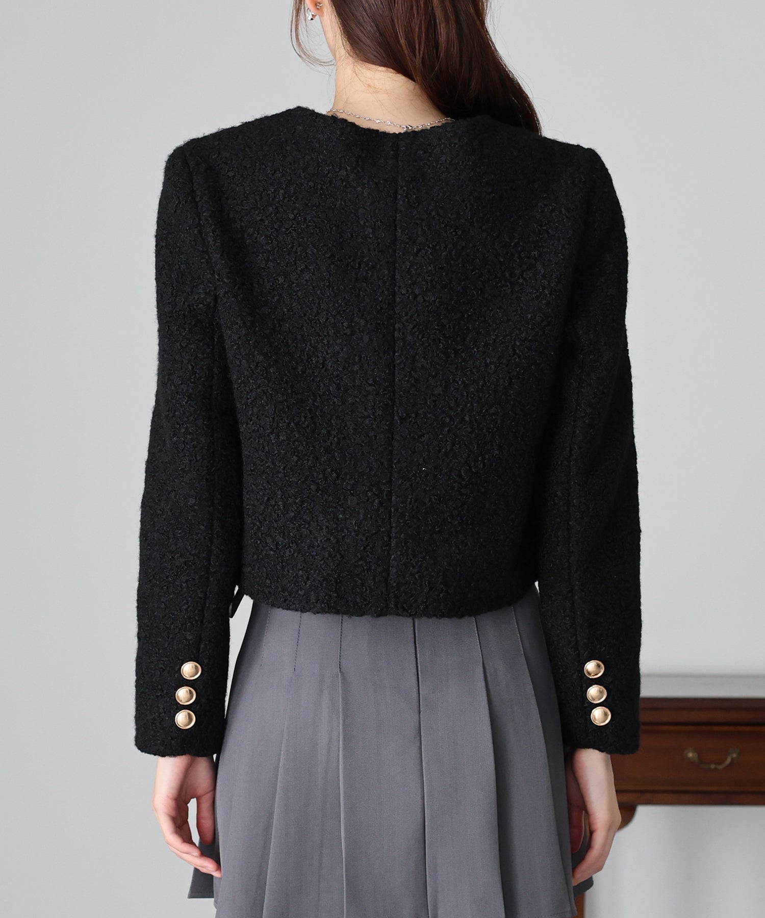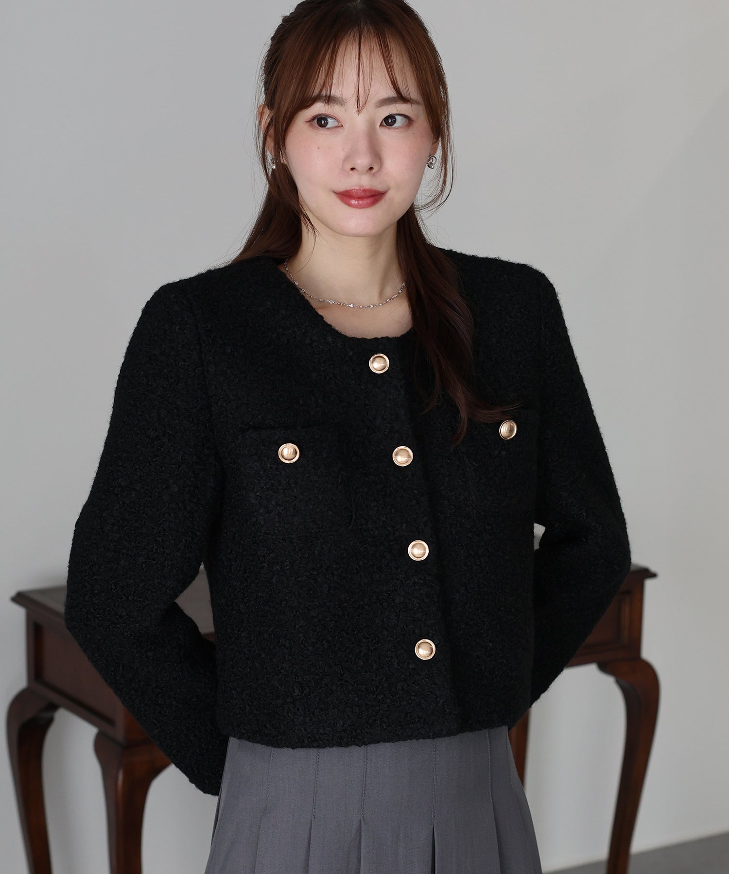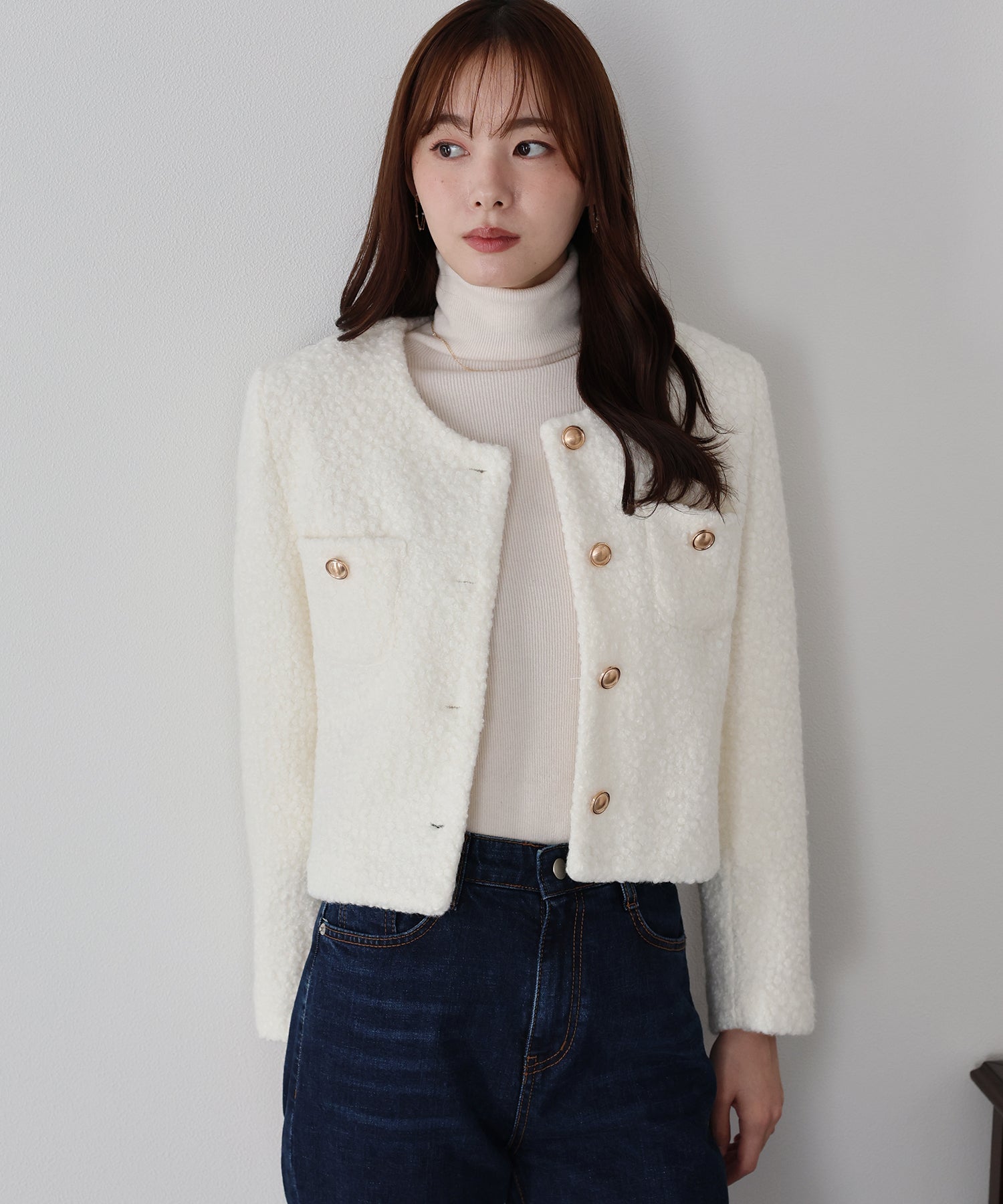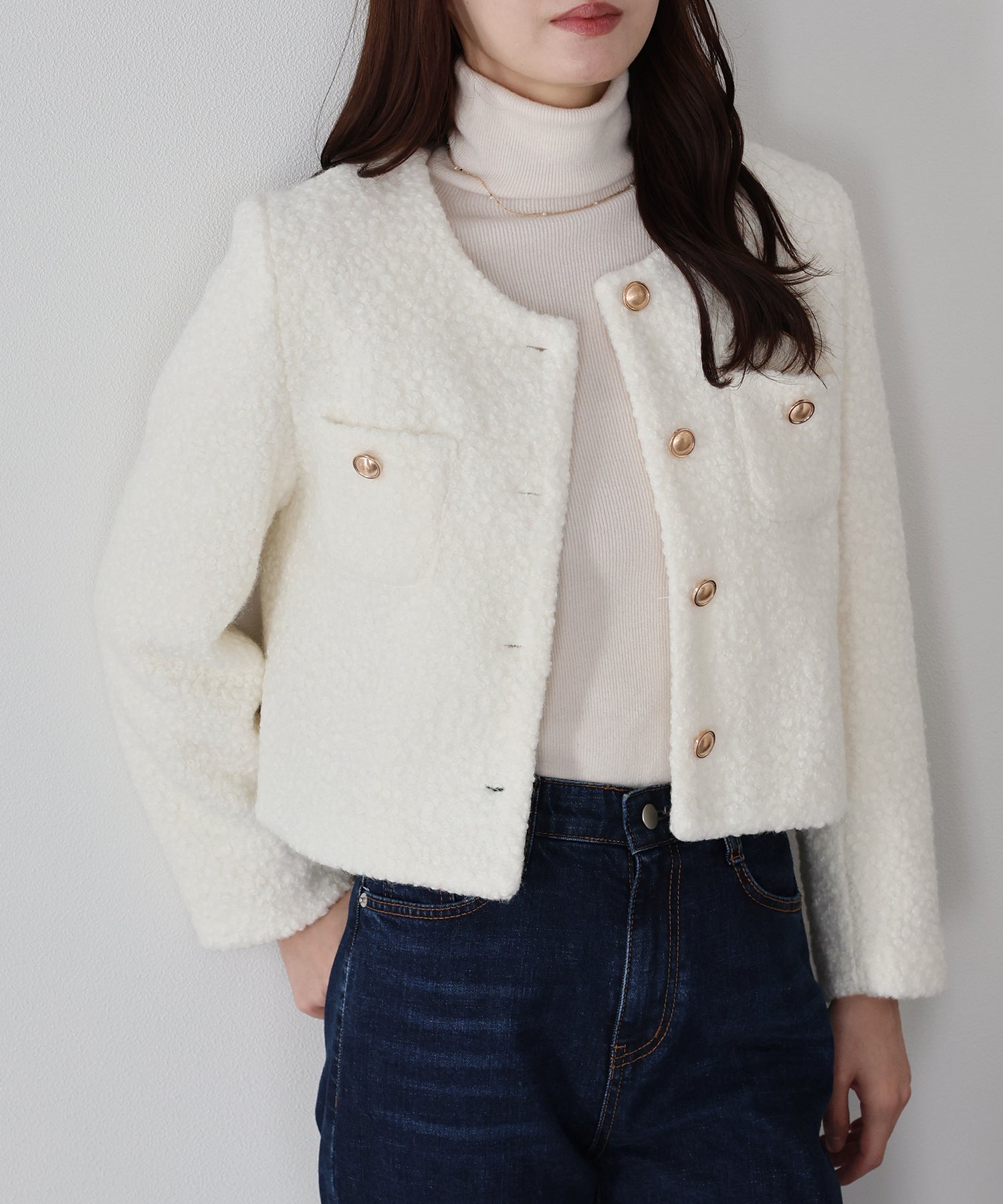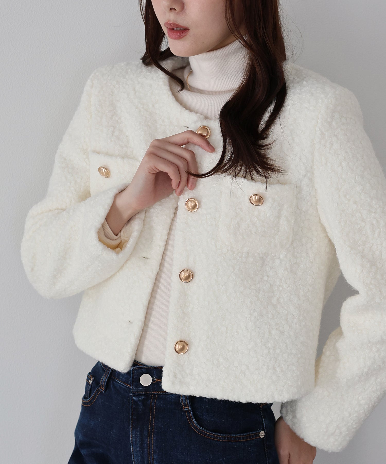 もこもこのボア素材を使用したショート丈ジャケット ?POINT 金ボタンがきれいめ上品な印象のボアジャケット。 暖かくて見た目より軽いボア素材をショート丈のコンパクトなジャケットに落とし込みました。 ボア素材ながら、金ボタンを施すことできちんと感ときれいめな印象を演出します。 エレガントな雰囲気で、オケージョンシーンの羽織としてもおすすめ。 見た目よりやわらかく軽いボア素材なので、着心地も良く気軽に羽織れる1枚です。