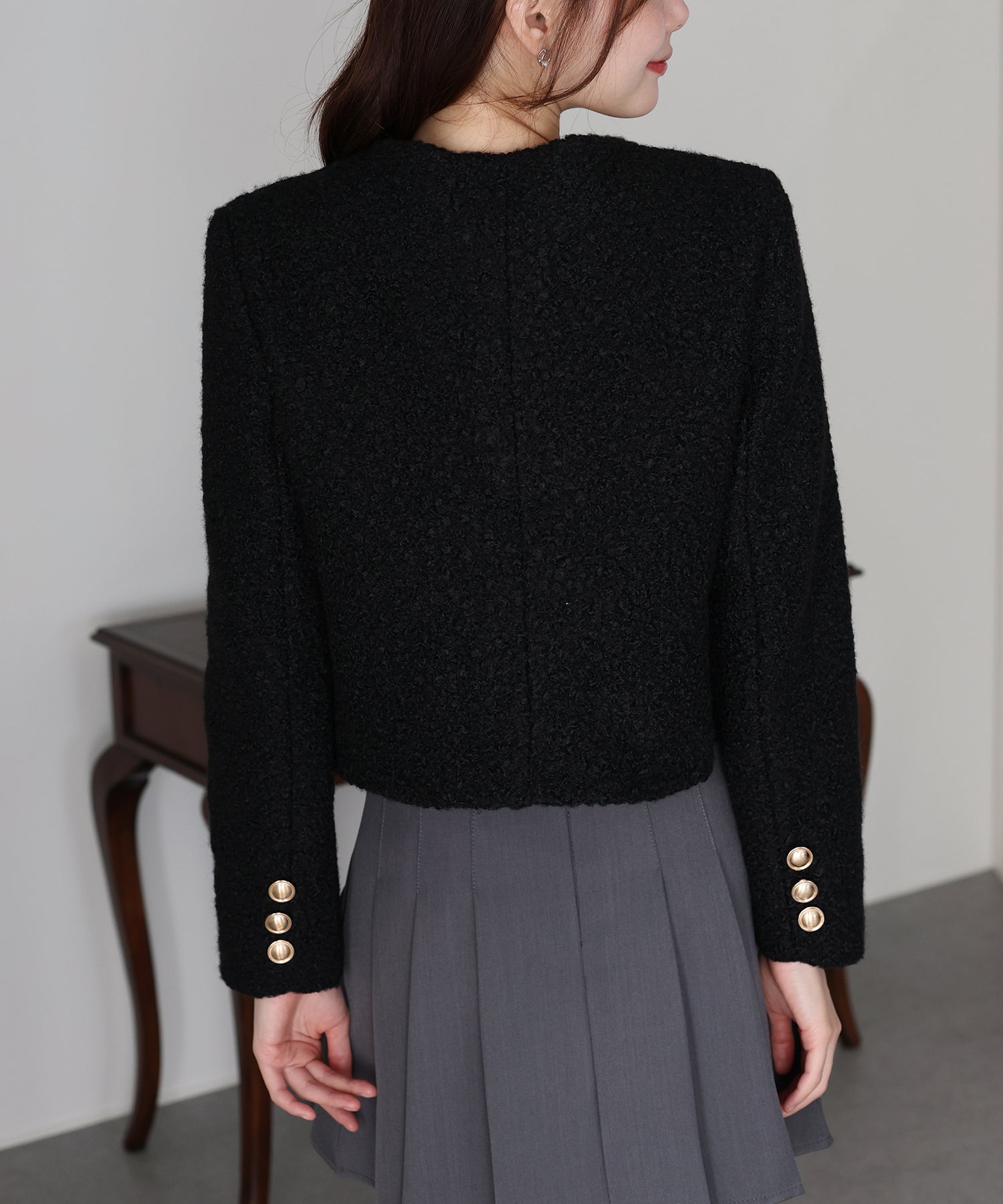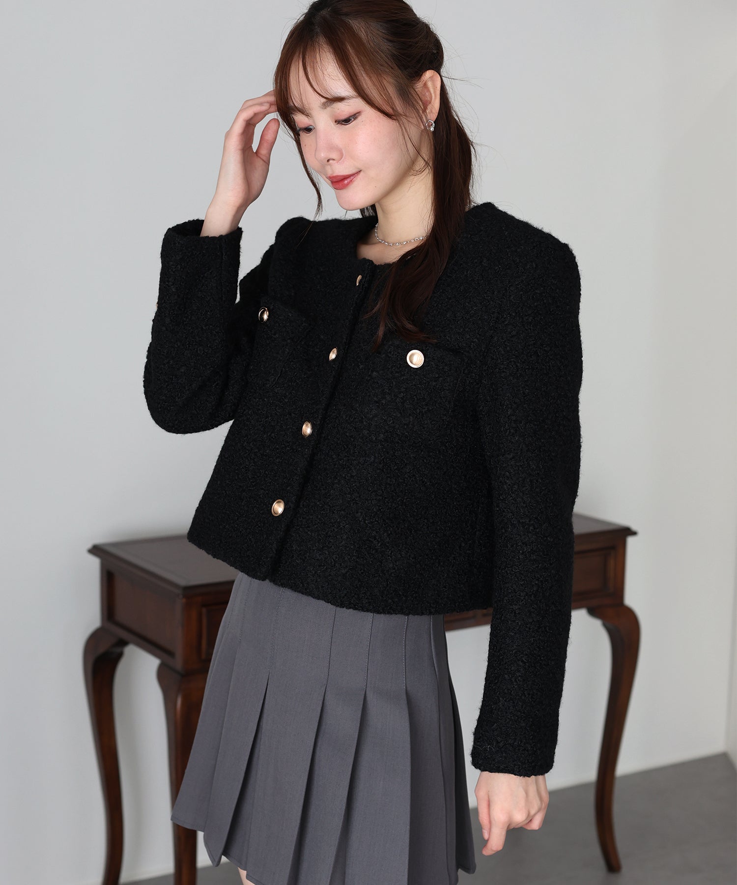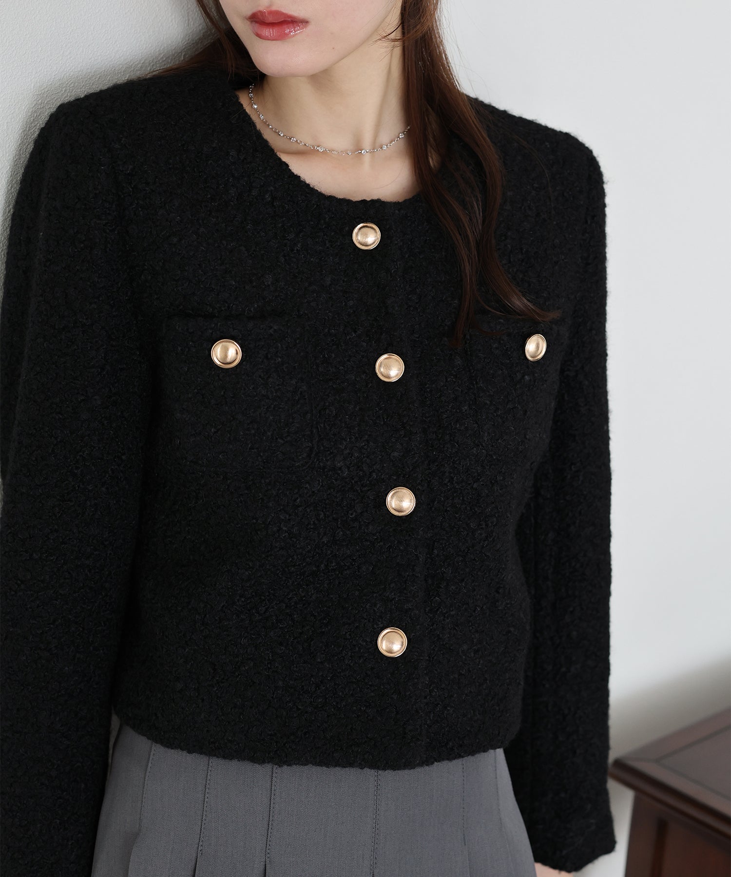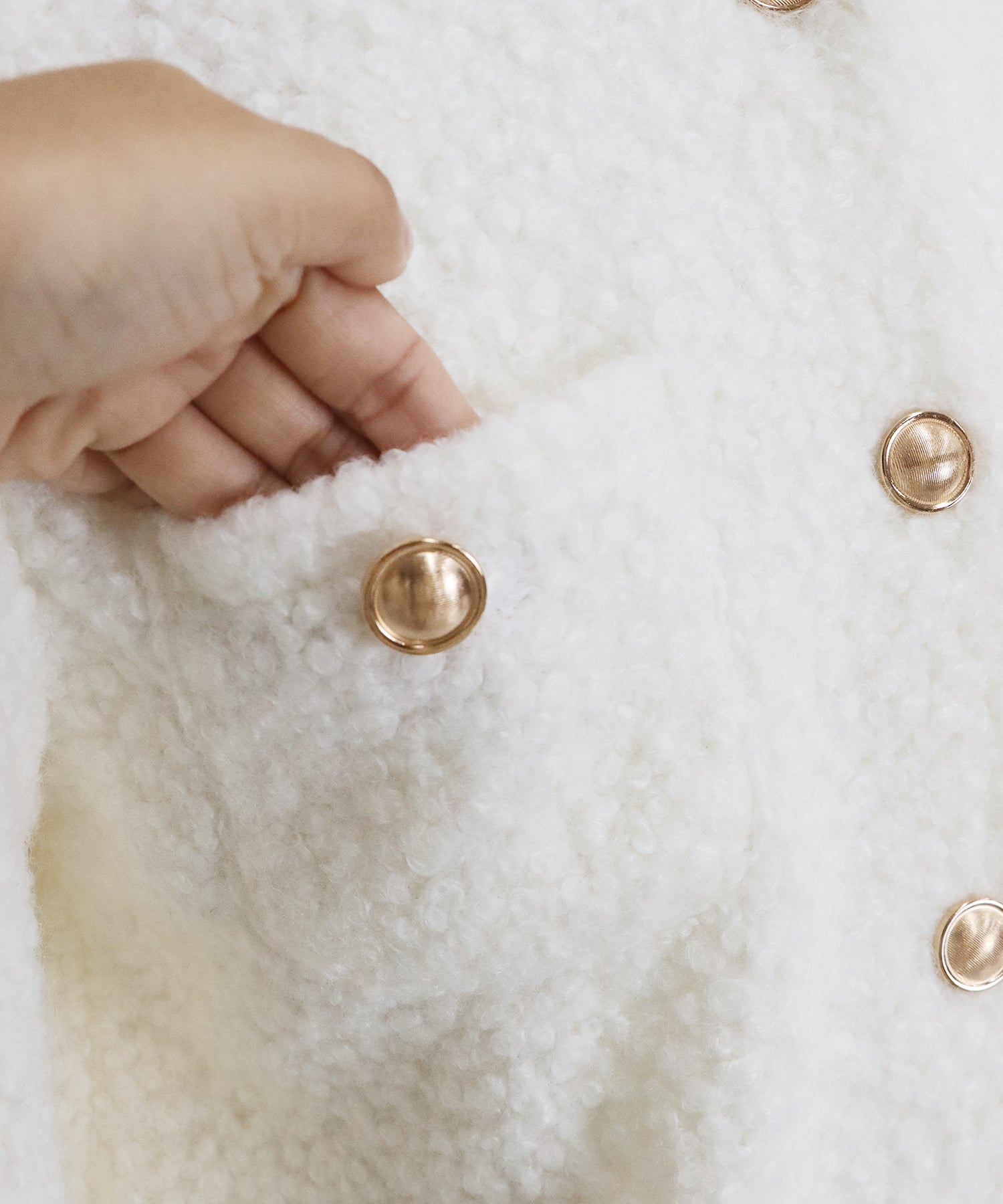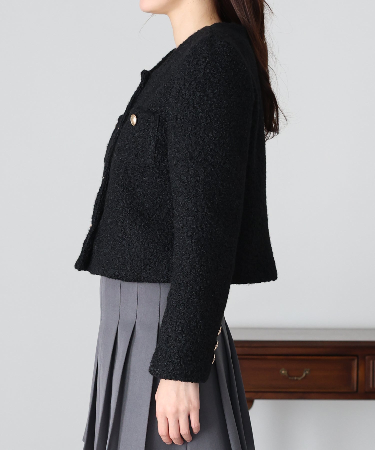 もこもこのボア素材を使用したショート丈ジャケット ?POINT 金ボタンがきれいめ上品な印象のボアジャケット。 暖かくて見た目より軽いボア素材をショート丈のコンパクトなジャケットに落とし込みました。 ボア素材ながら、金ボタンを施すことできちんと感ときれいめな印象を演出します。 エレガントな雰囲気で、オケージョンシーンの羽織としてもおすすめ。 見た目よりやわらかく軽いボア素材なので、着心地も良く気軽に羽織れる1枚です。