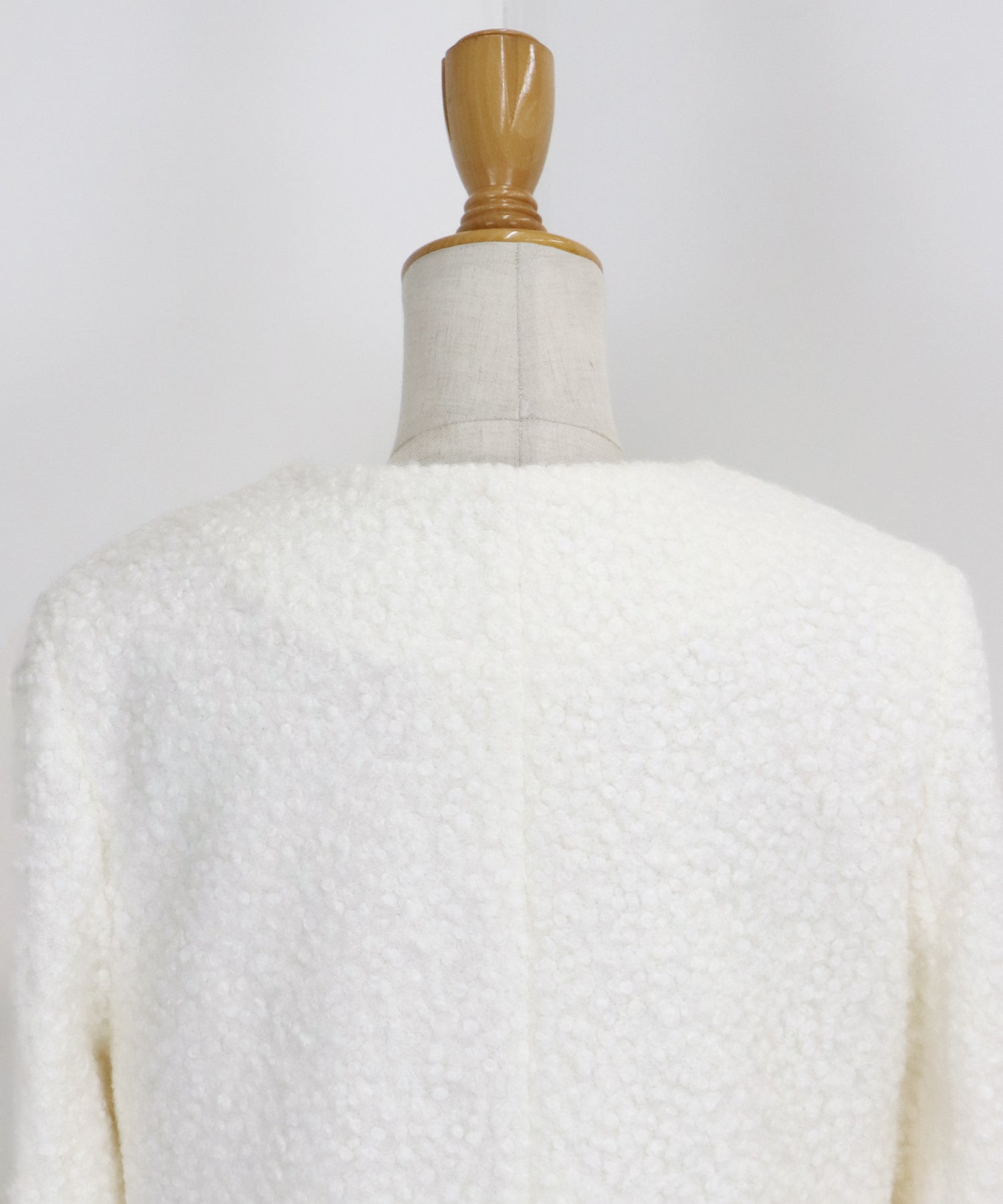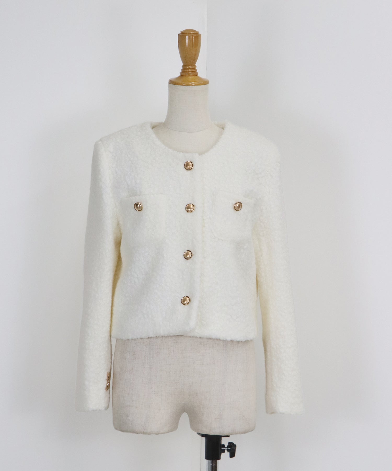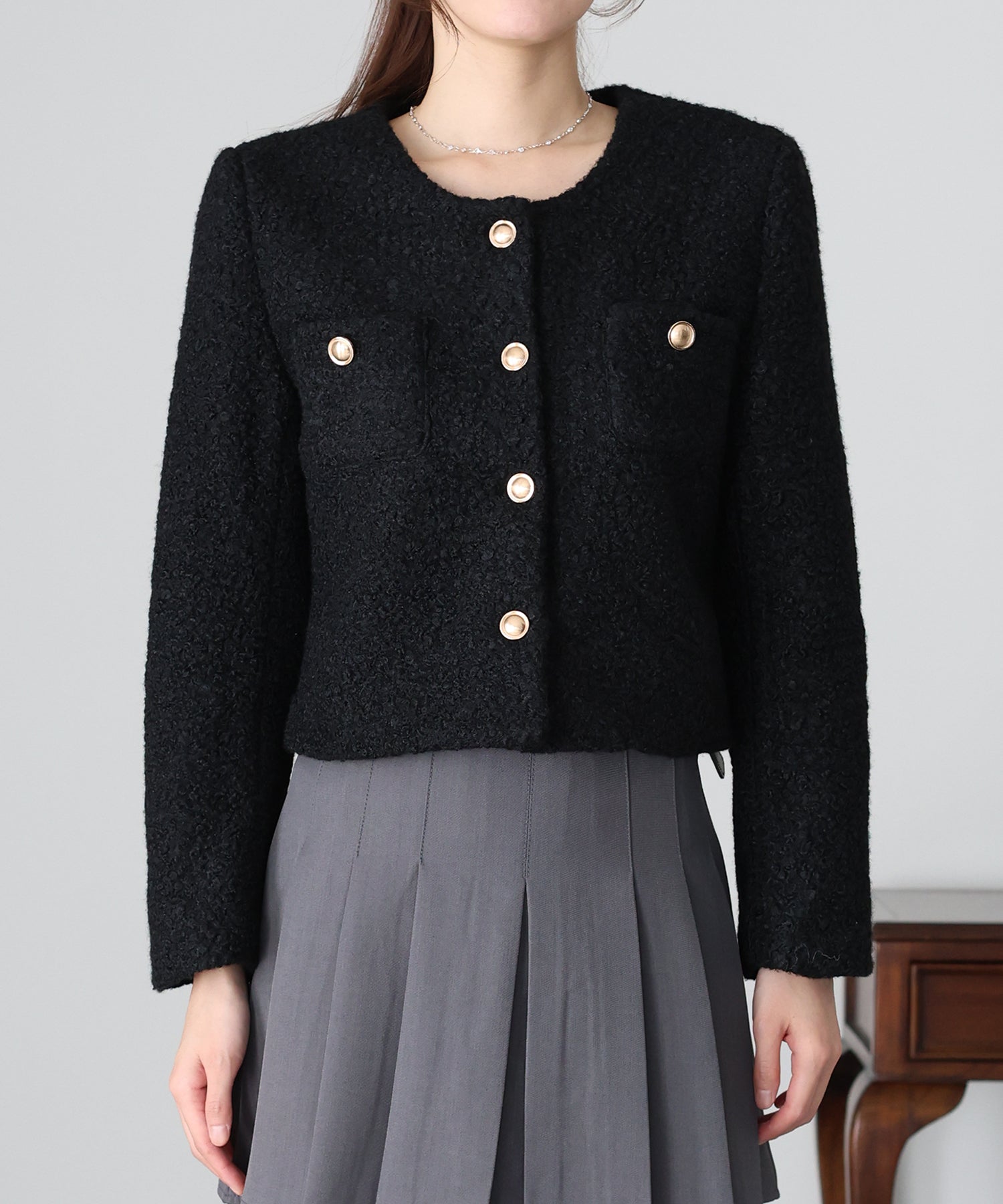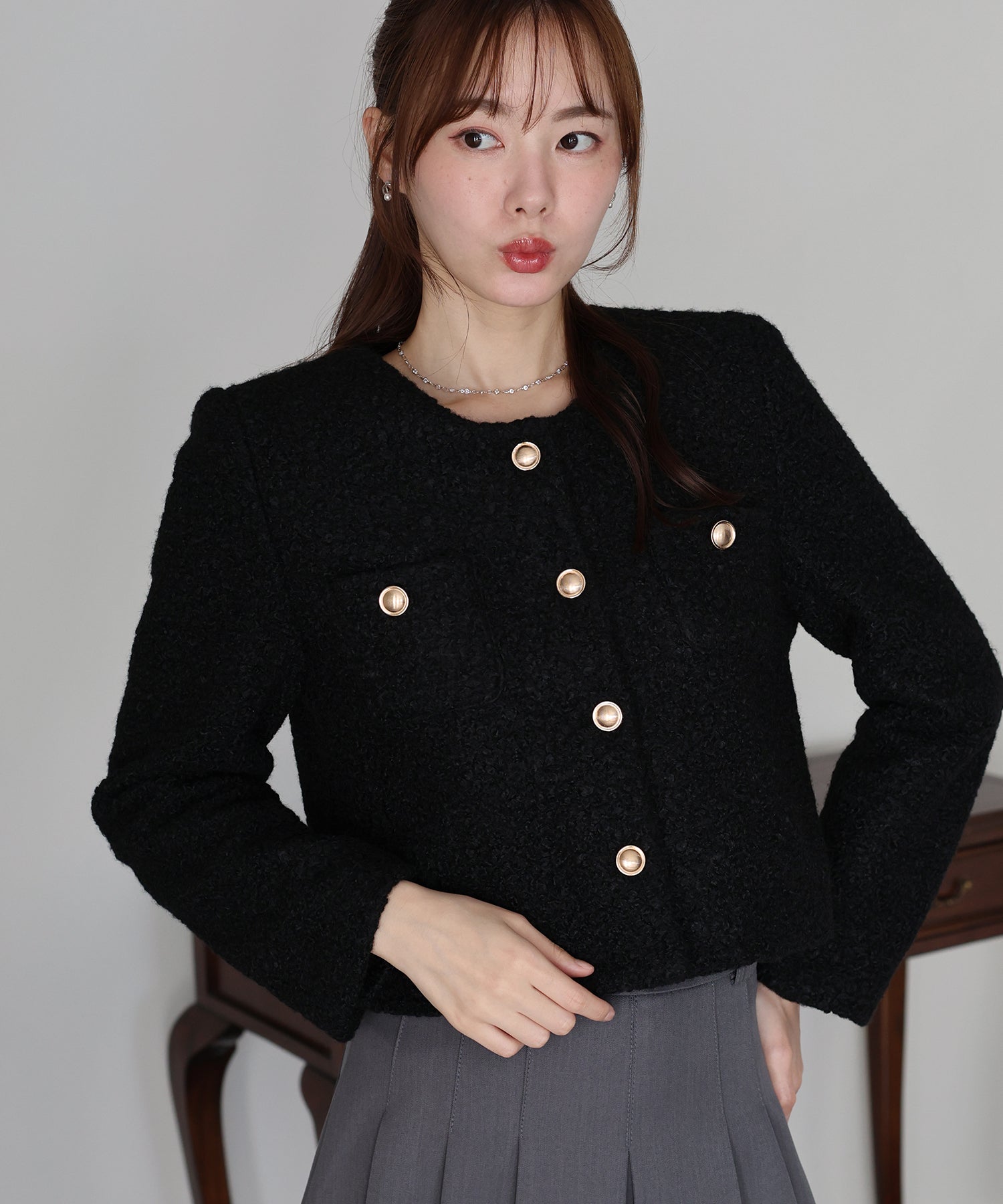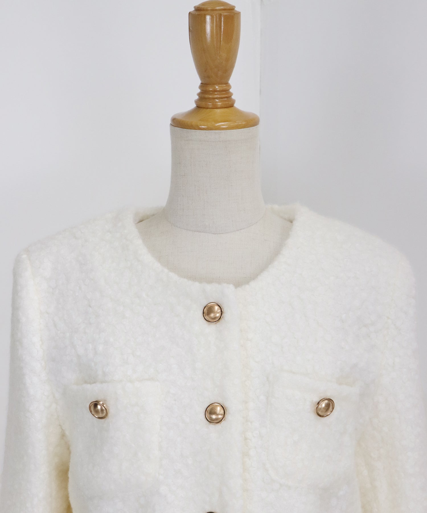 もこもこのボア素材を使用したショート丈ジャケット ?POINT 金ボタンがきれいめ上品な印象のボアジャケット。 暖かくて見た目より軽いボア素材をショート丈のコンパクトなジャケットに落とし込みました。 ボア素材ながら、金ボタンを施すことできちんと感ときれいめな印象を演出します。 エレガントな雰囲気で、オケージョンシーンの羽織としてもおすすめ。 見た目よりやわらかく軽いボア素材なので、着心地も良く気軽に羽織れる1枚です。