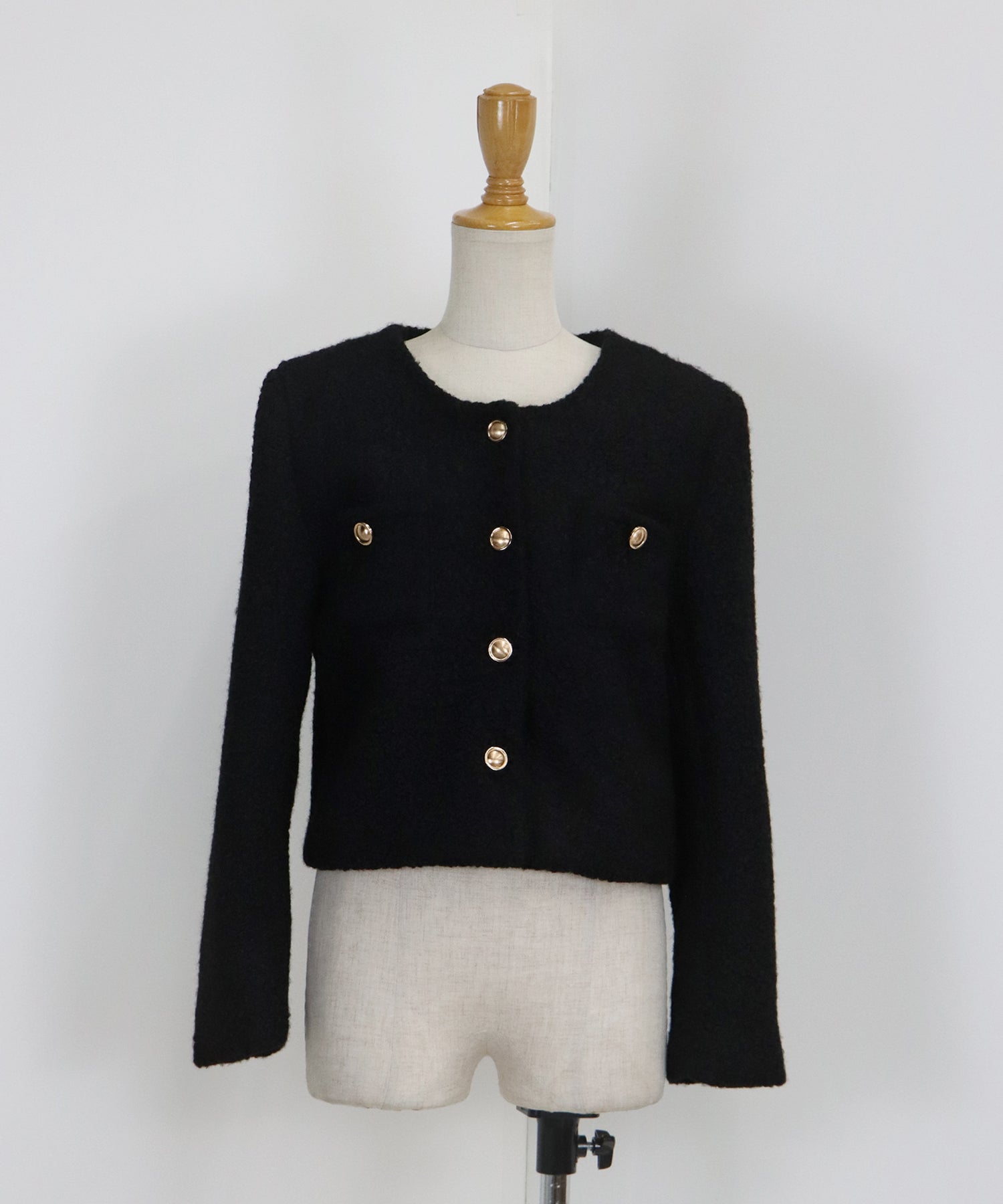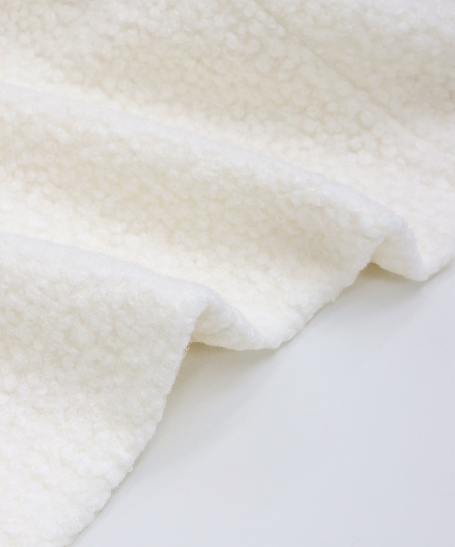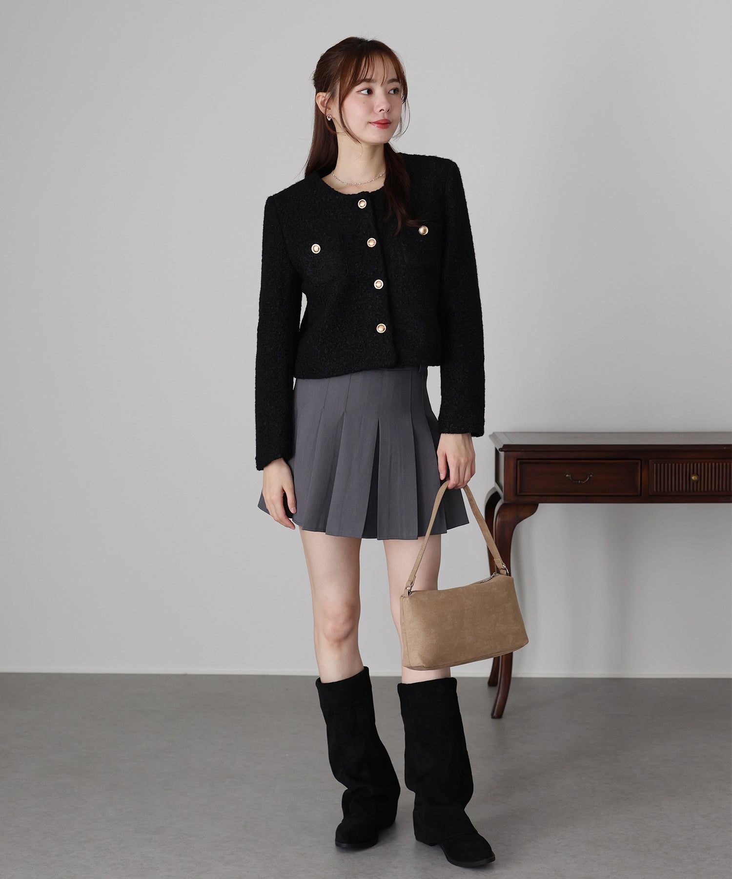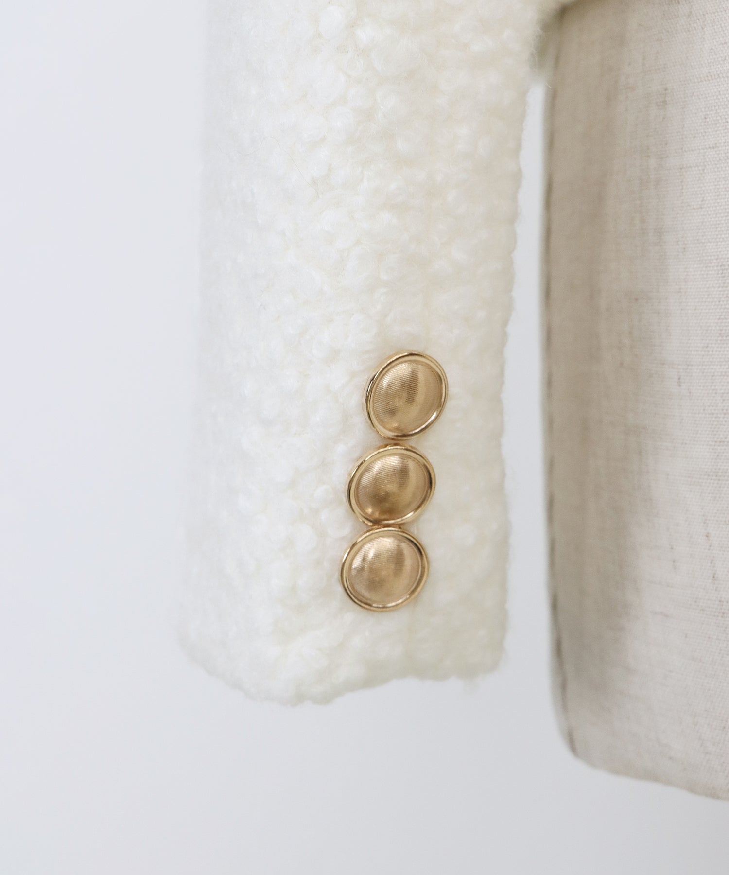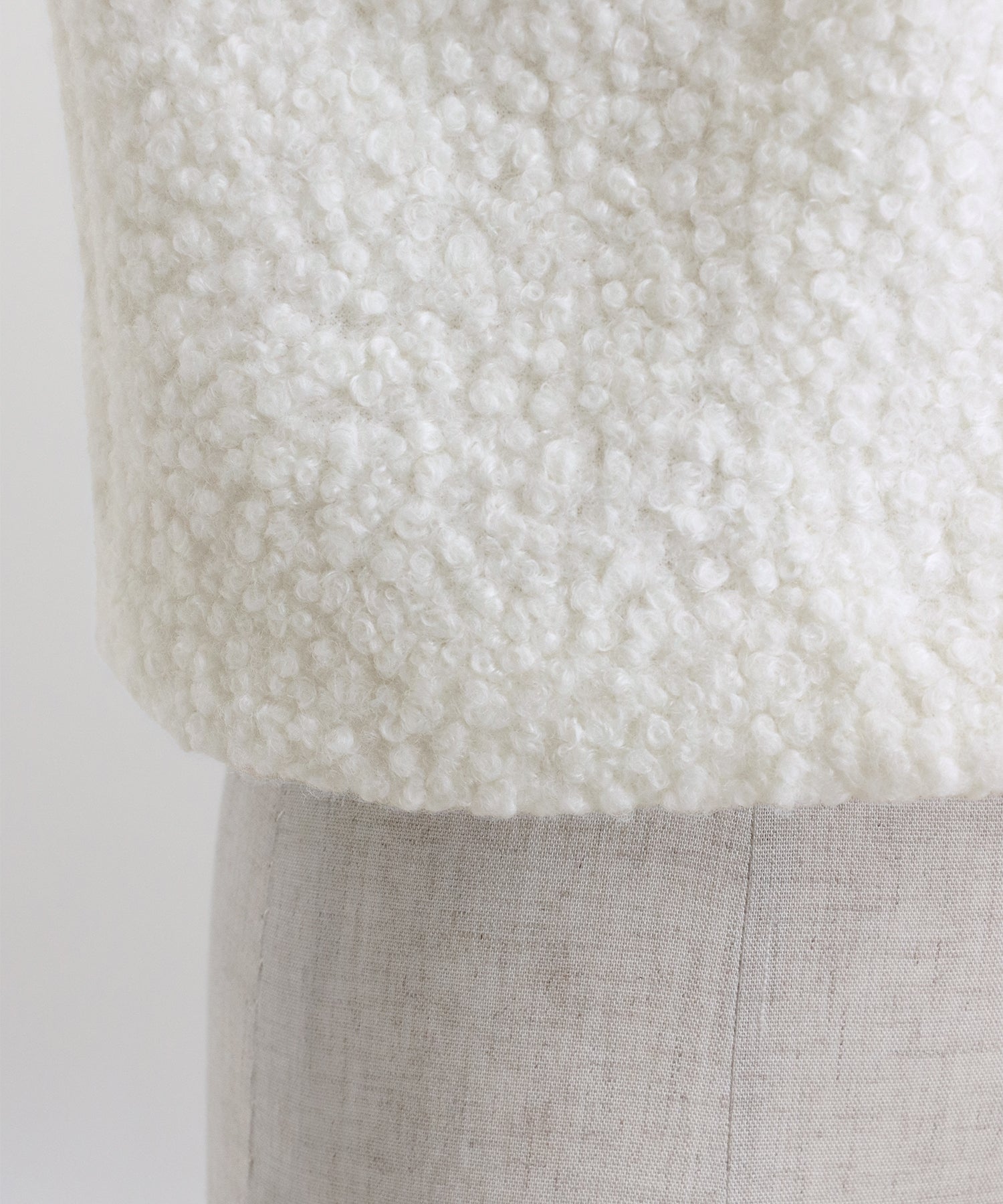 もこもこのボア素材を使用したショート丈ジャケット ?POINT 金ボタンがきれいめ上品な印象のボアジャケット。 暖かくて見た目より軽いボア素材をショート丈のコンパクトなジャケットに落とし込みました。 ボア素材ながら、金ボタンを施すことできちんと感ときれいめな印象を演出します。 エレガントな雰囲気で、オケージョンシーンの羽織としてもおすすめ。 見た目よりやわらかく軽いボア素材なので、着心地も良く気軽に羽織れる1枚です。
