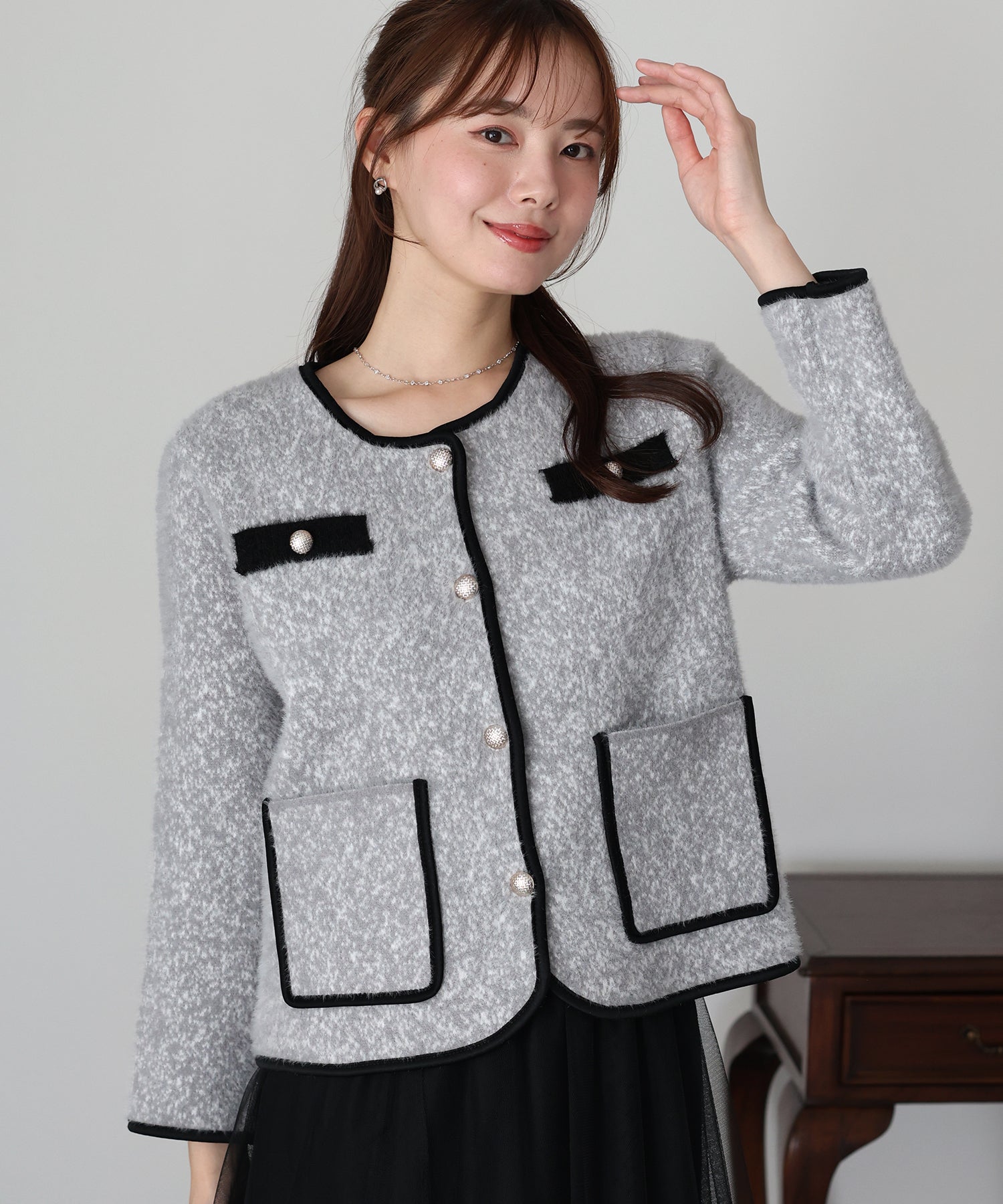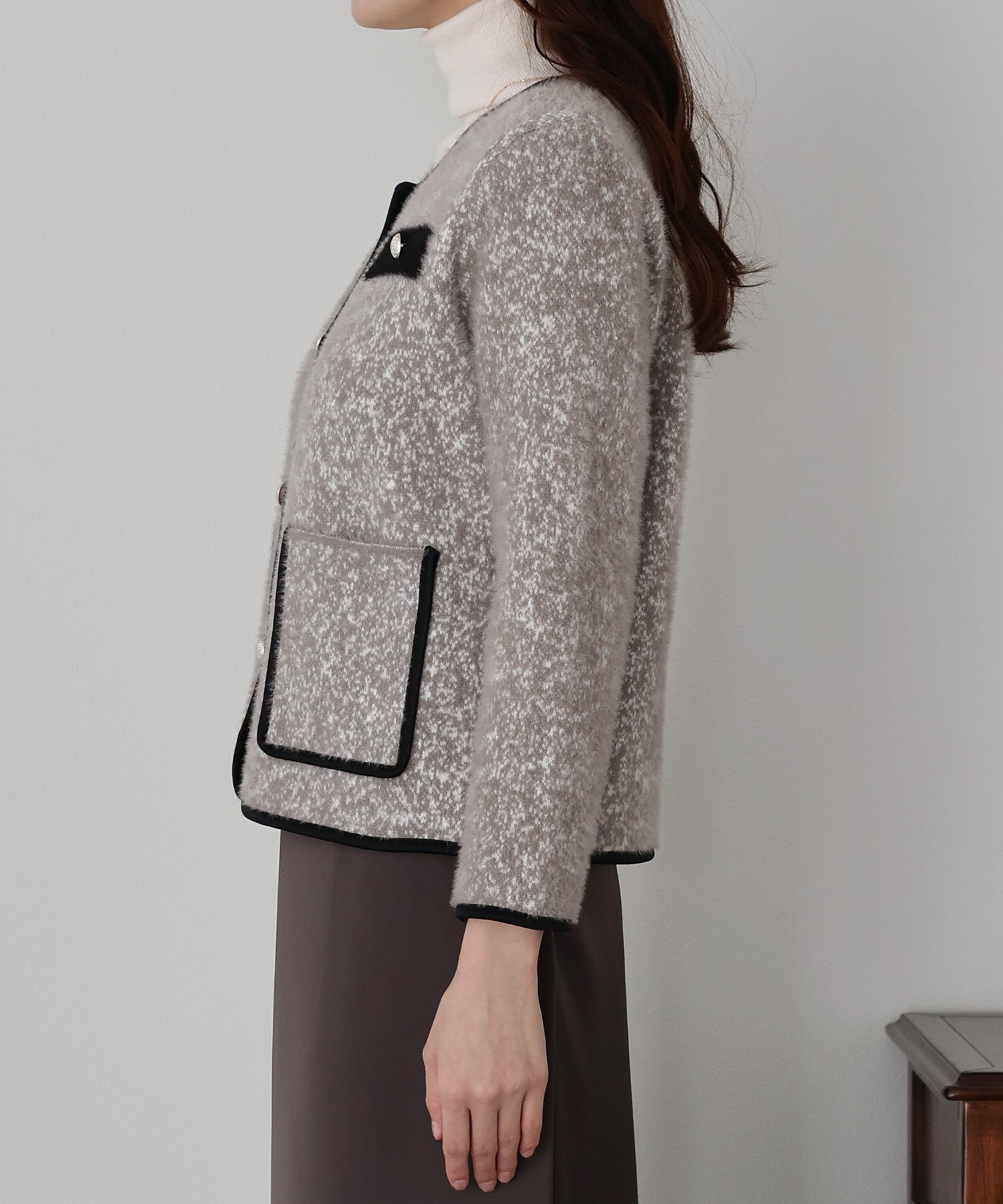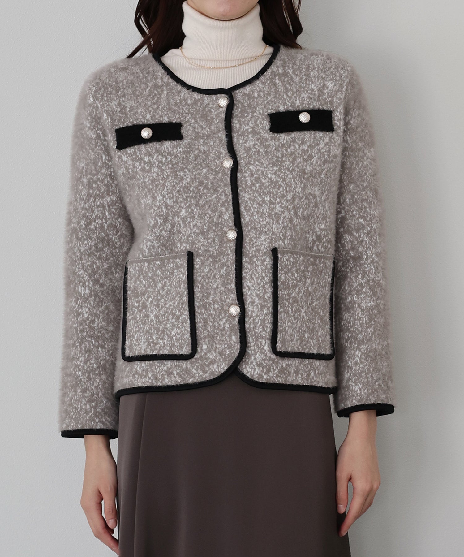 上品なムードを演出するシャギージャケット ?POINT ミックスカラーのシャギー生地が上品な印象のノーカラージャケット。 ふんわりとした毛足短めのシャギー素材がやわらかな肌触りで暖かく、 冬のきれいめな羽織としてぴったりのジャケットです。 すっきりとしたノーカラーデザイン×バイカラーパイピングで上品な印象に、 シルバーボタンできちんと感を演出。 通勤コーデやオケージョンシーンの羽織としても活躍します。 一枚持っていて損のないおすすめのアイテムです。