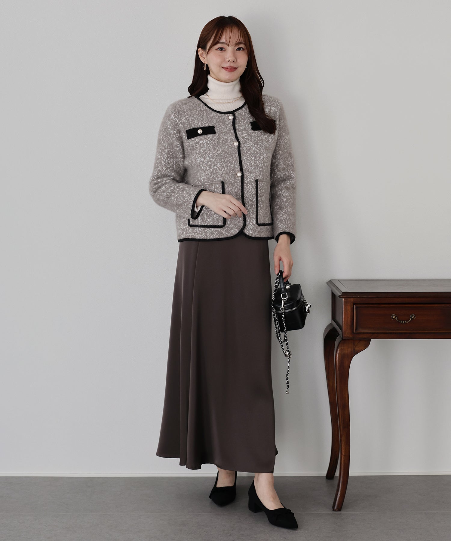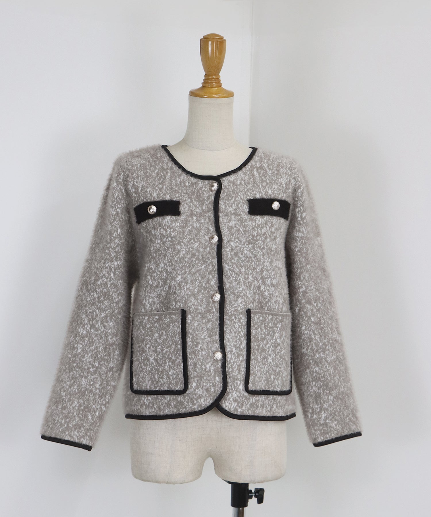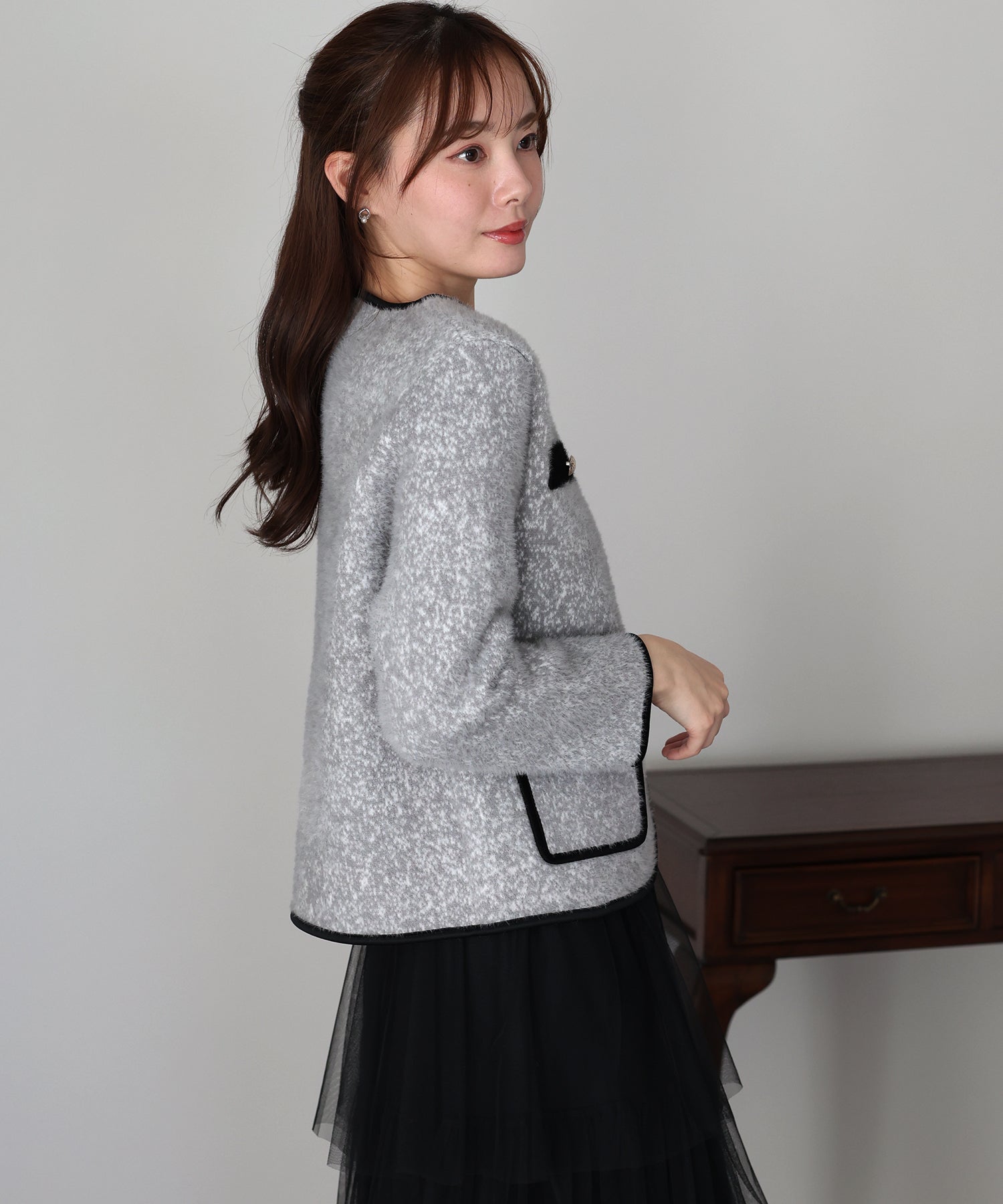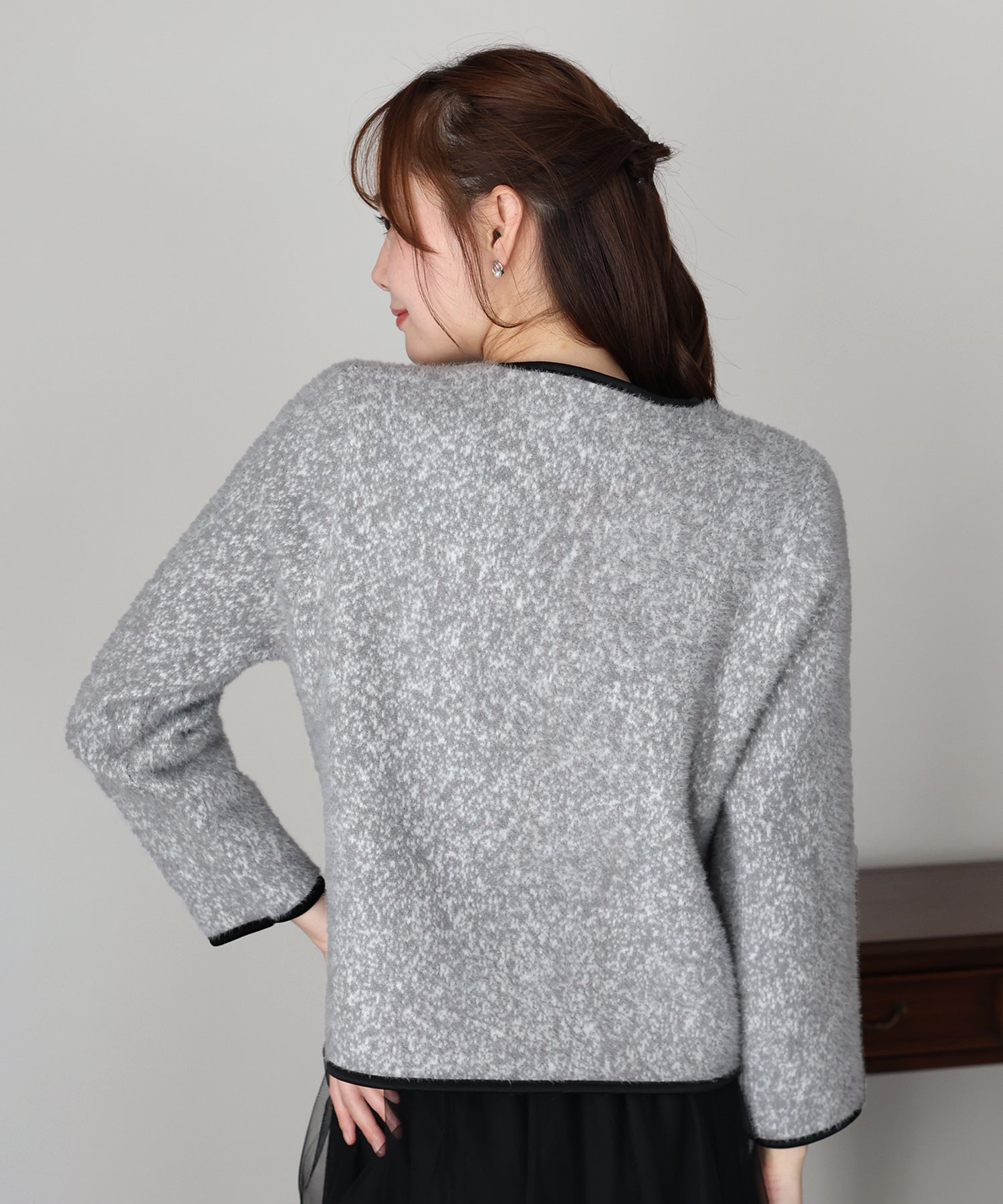 上品なムードを演出するシャギージャケット ?POINT ミックスカラーのシャギー生地が上品な印象のノーカラージャケット。 ふんわりとした毛足短めのシャギー素材がやわらかな肌触りで暖かく、 冬のきれいめな羽織としてぴったりのジャケットです。 すっきりとしたノーカラーデザイン×バイカラーパイピングで上品な印象に、 シルバーボタンできちんと感を演出。 通勤コーデやオケージョンシーンの羽織としても活躍します。 一枚持っていて損のないおすすめのアイテムです。
