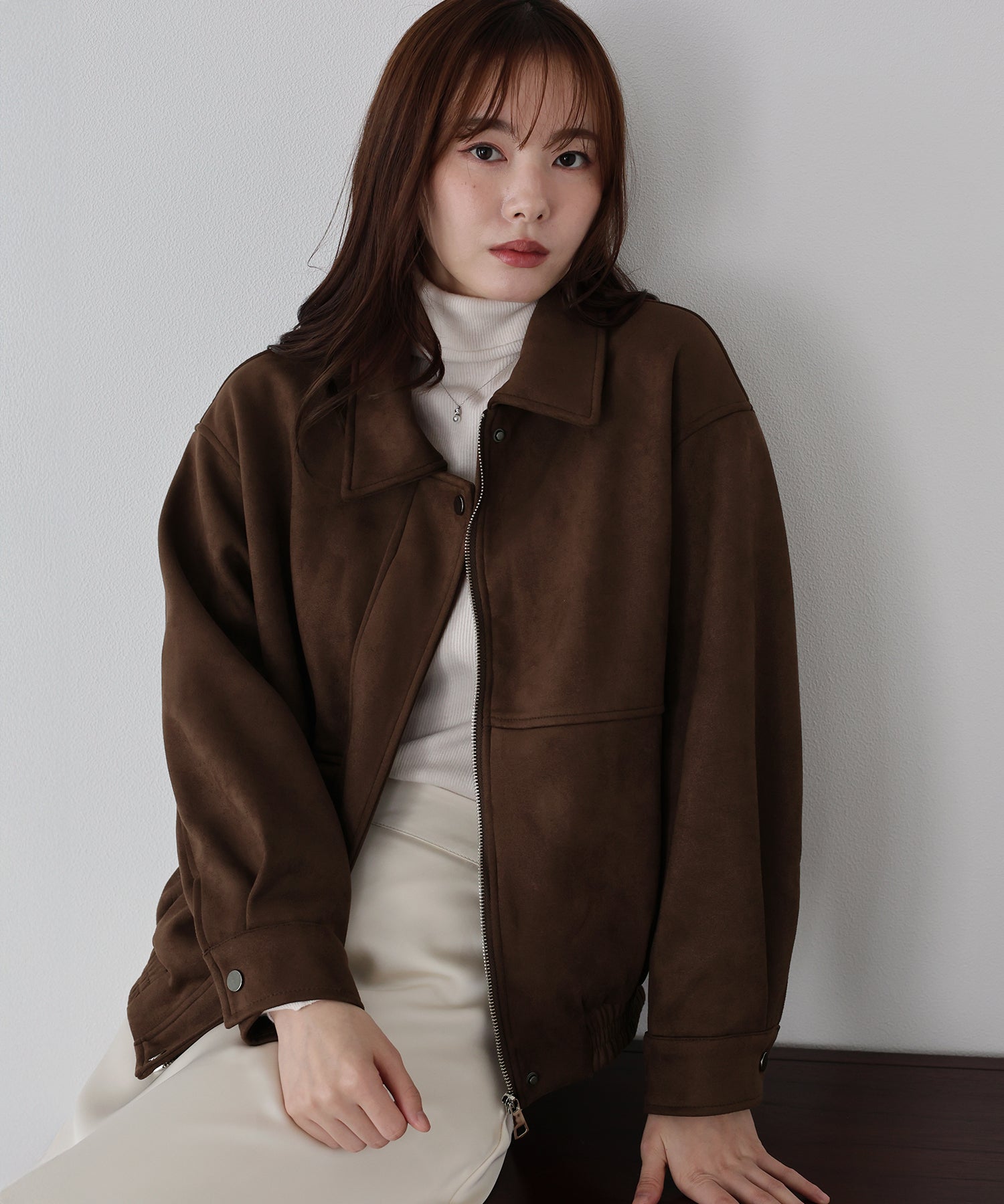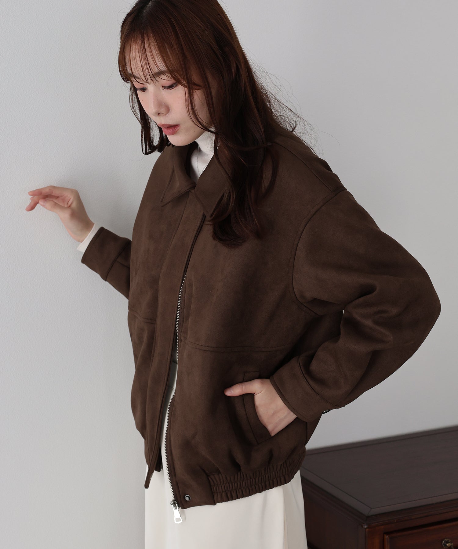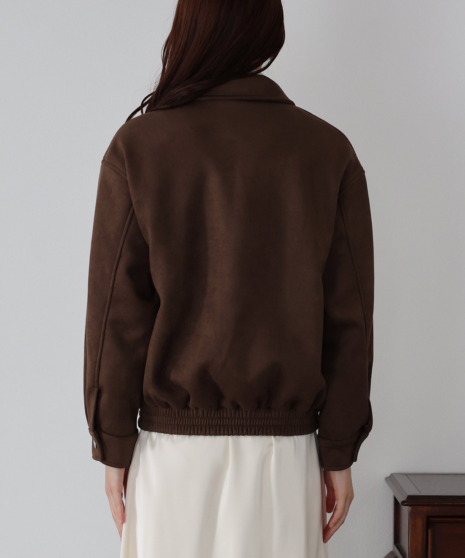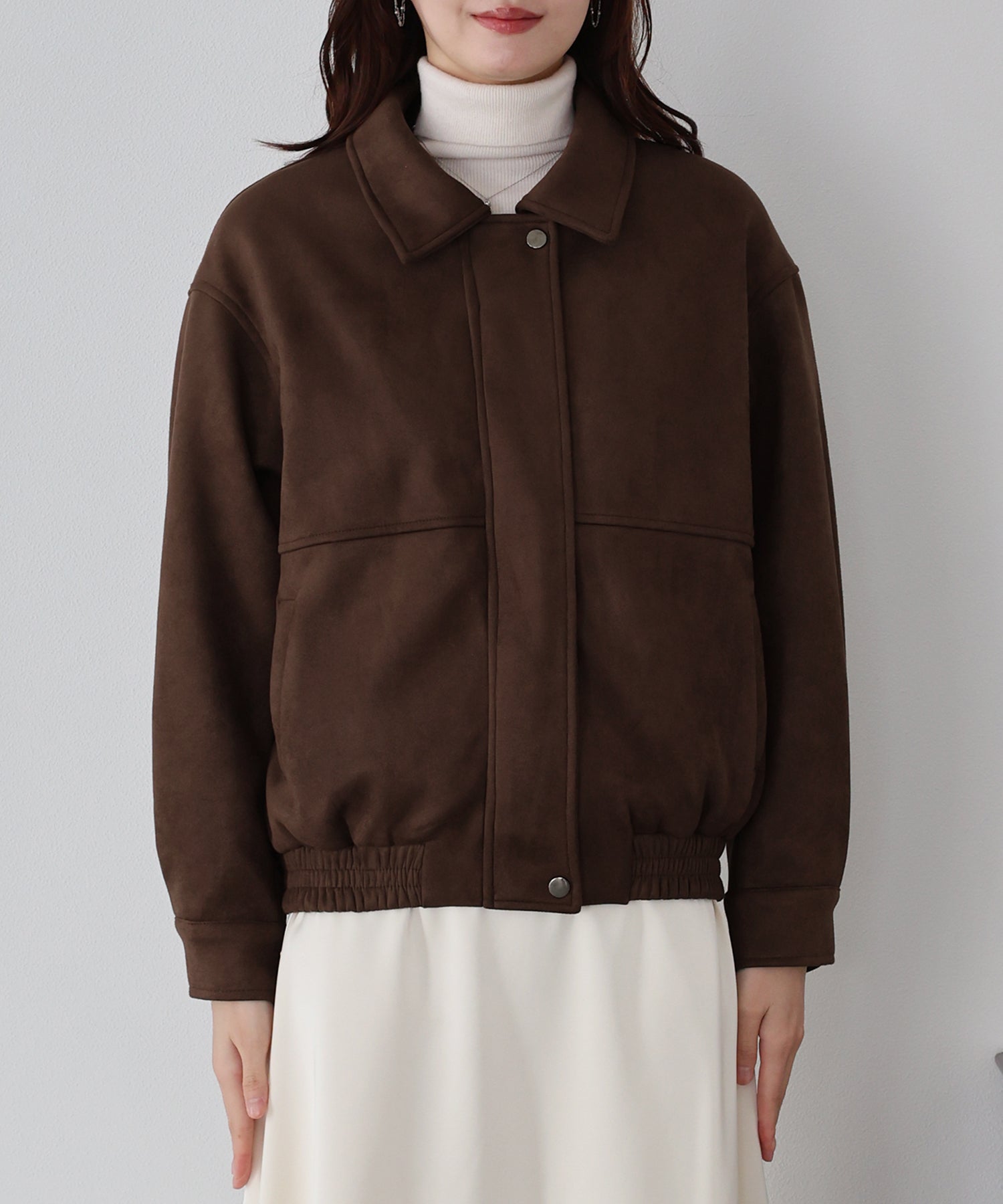 ヴィンテージ感がお洒落なジップスウェードジャケット ?POINT フロントのジップラインにあしらったボタンディテールが、さりげないアクセントを添えるスウェードジャケット。 ジップを閉めた上からボタンを留めることで、すっきりとしたシルエットに仕上がり、上品な印象をプラスします。 ヴィンテージライクなムラ感のあるスウェード素材が、こなれた雰囲気を演出。 着丈はオーバーすぎないバランスで、パンツにもスカートにも合わせやすい絶妙な丈感です。 カジュアルにもきれいめにもマッチする、今季注目の万能アウター。