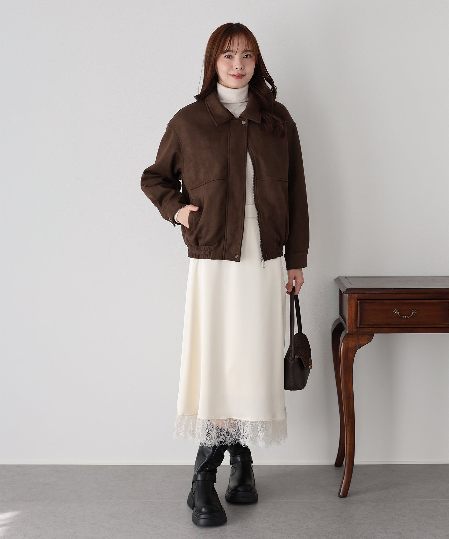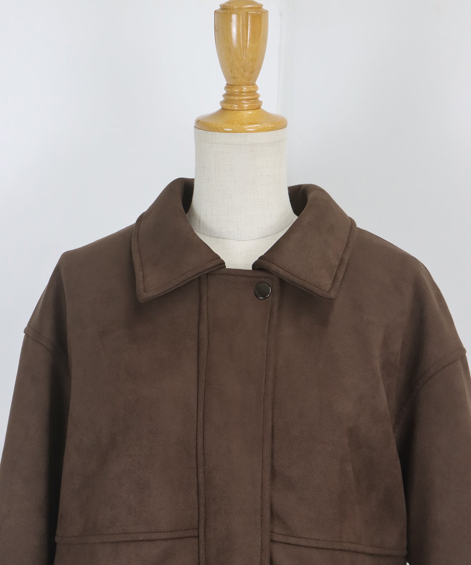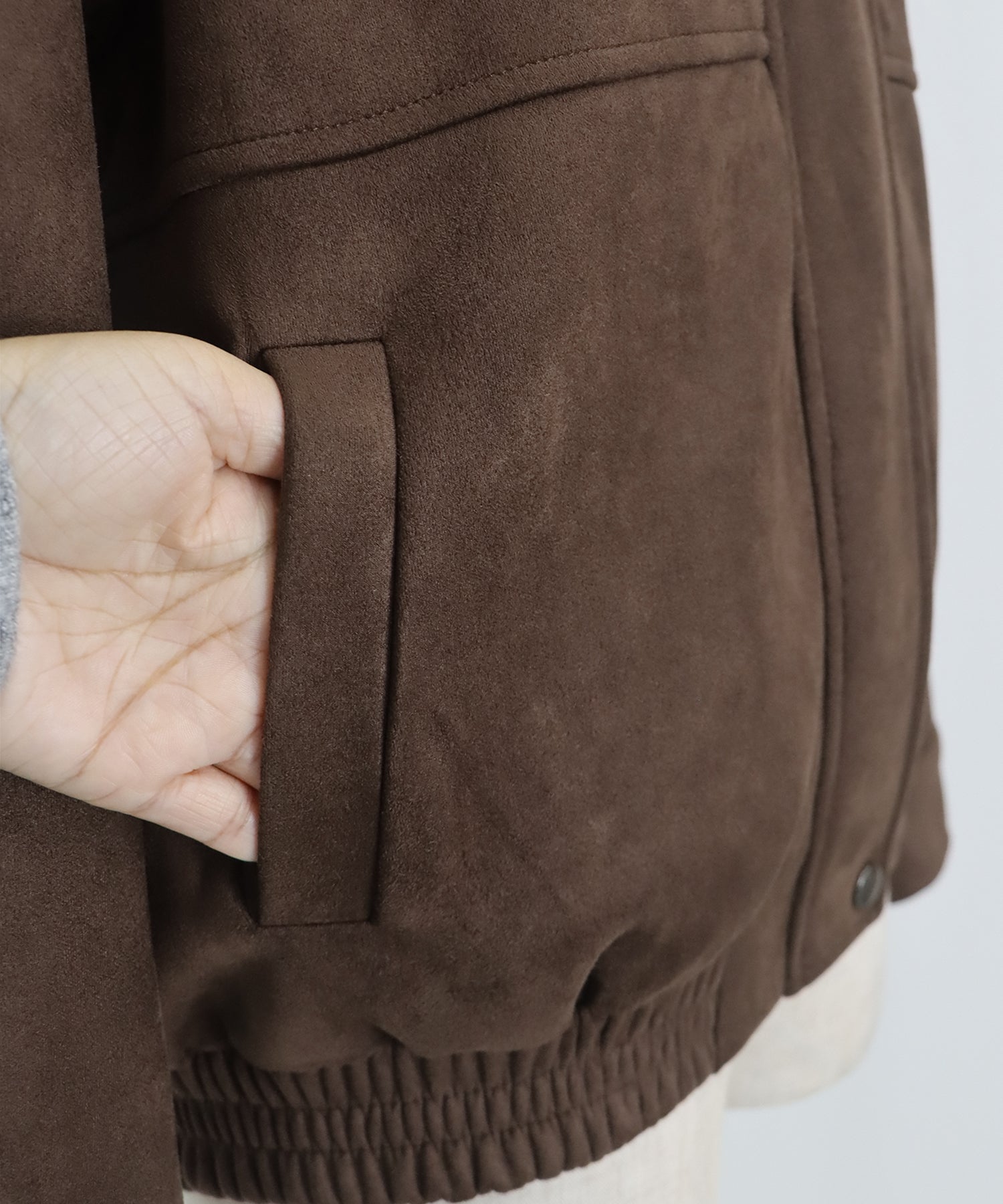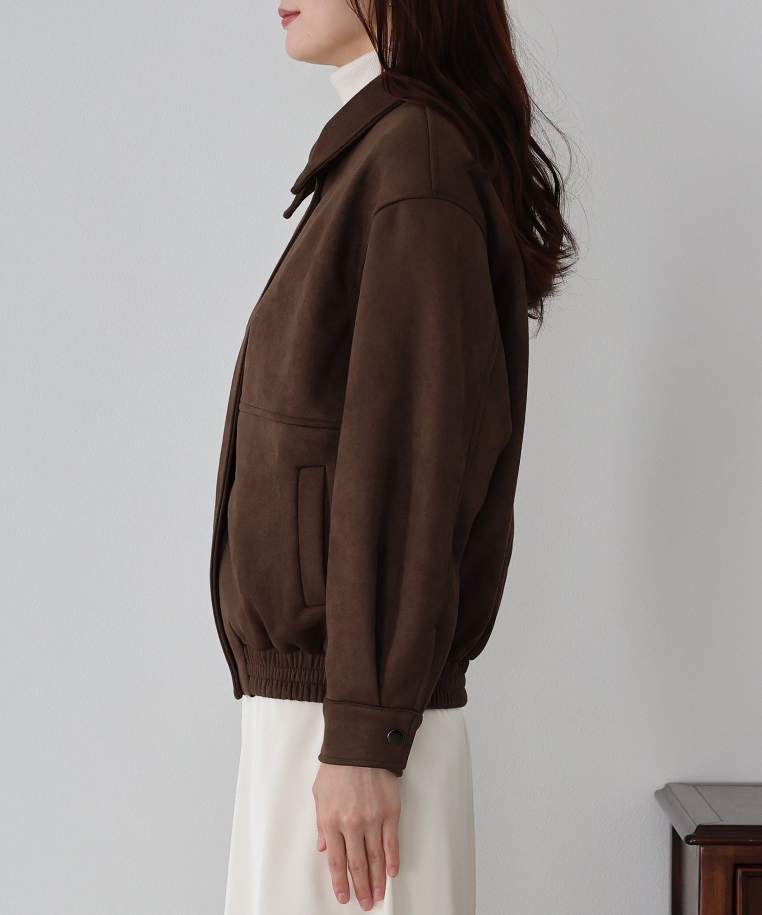 ヴィンテージ感がお洒落なジップスウェードジャケット ?POINT フロントのジップラインにあしらったボタンディテールが、さりげないアクセントを添えるスウェードジャケット。 ジップを閉めた上からボタンを留めることで、すっきりとしたシルエットに仕上がり、上品な印象をプラスします。 ヴィンテージライクなムラ感のあるスウェード素材が、こなれた雰囲気を演出。 着丈はオーバーすぎないバランスで、パンツにもスカートにも合わせやすい絶妙な丈感です。 カジュアルにもきれいめにもマッチする、今季注目の万能アウター。