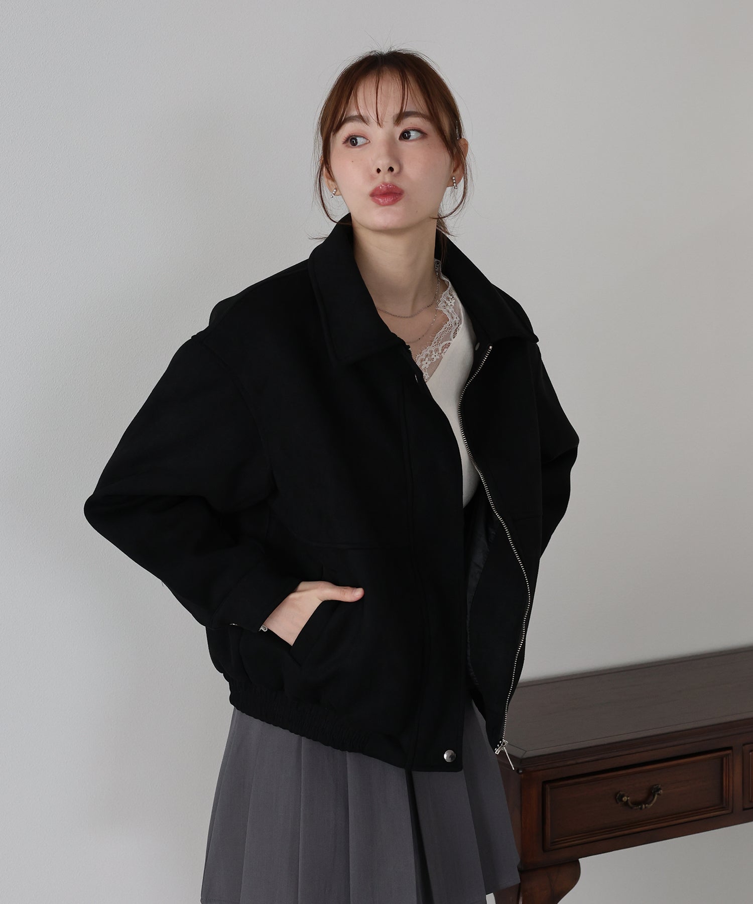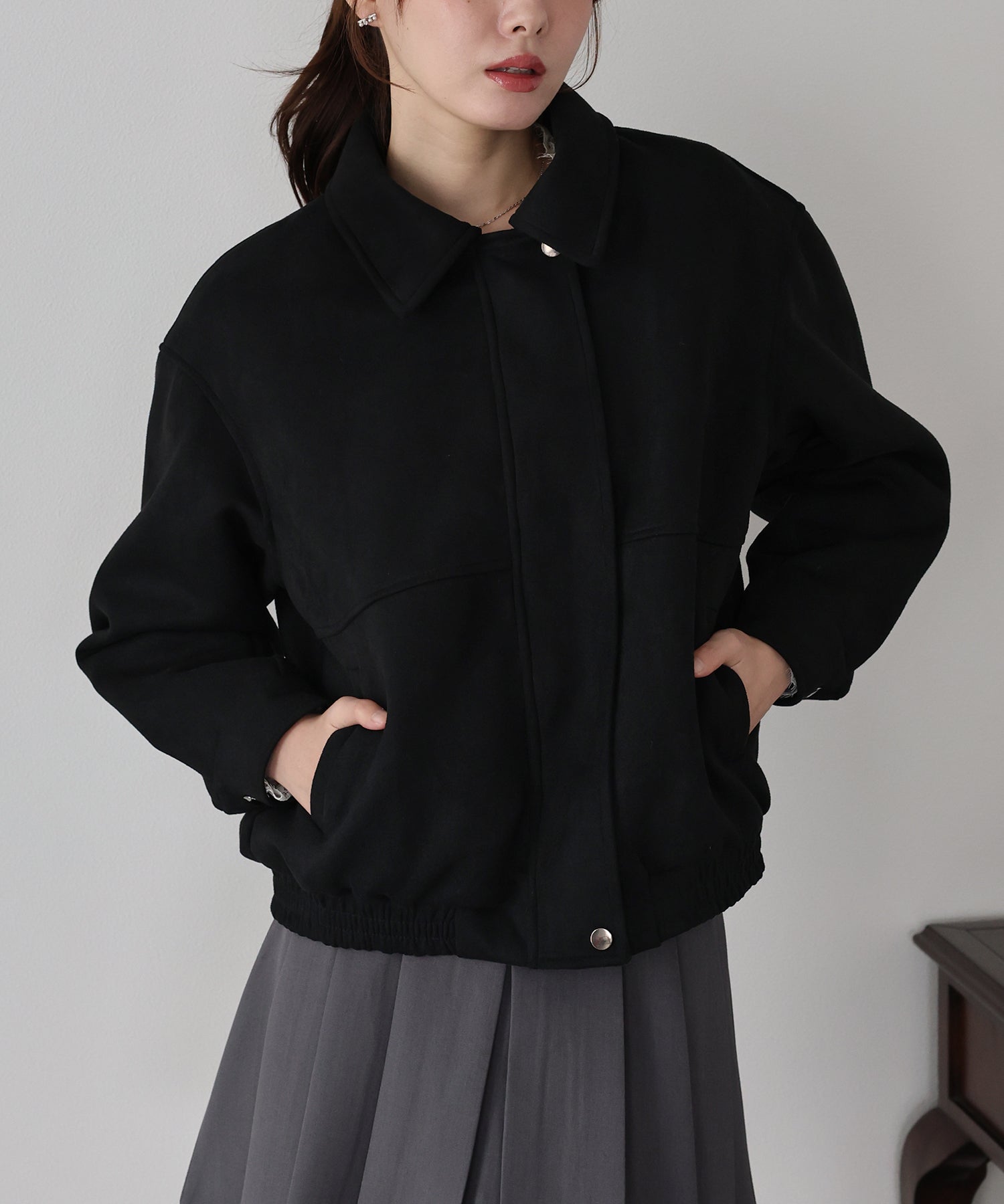 ?DETAIL フロントジップ 上下スナップボタン仕様 袖口ボタン付き 裾ゴム仕様 ポケット有り 裏地有り