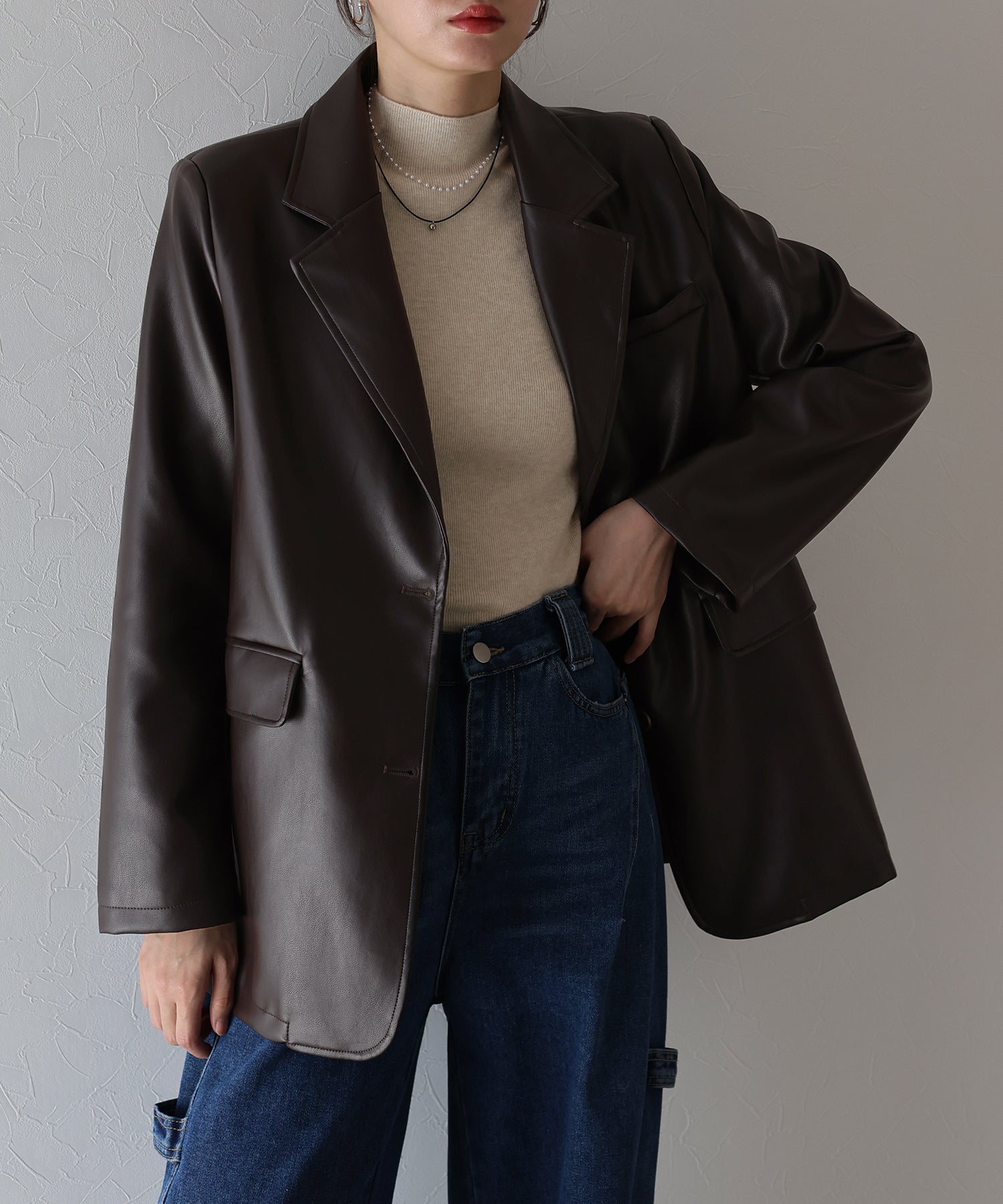 程よい厚みとハリのあるフェイクレザー素材が、上品で洗練された印象を与えるテーラードジャケット。