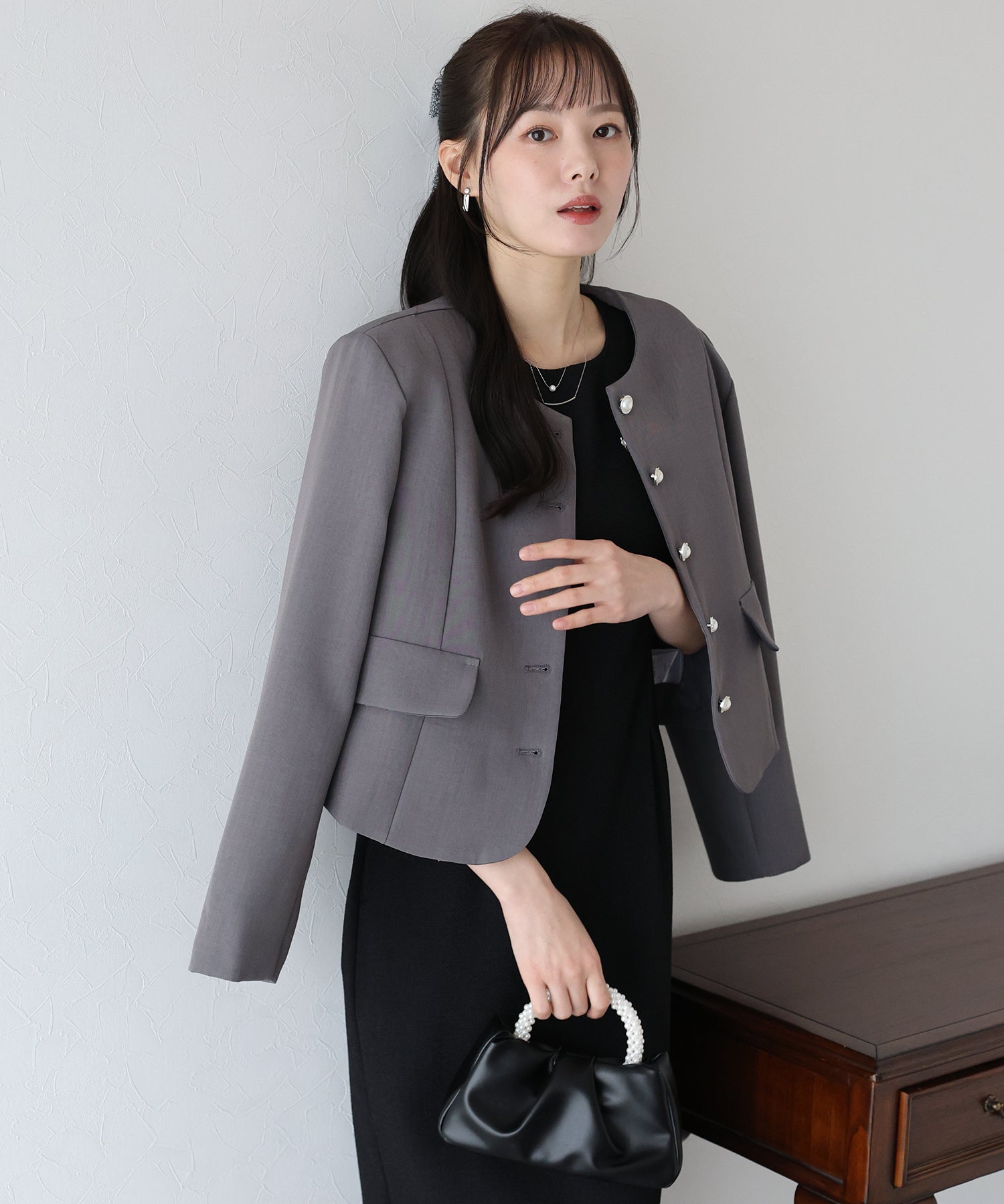 ?DETAIL ノーカラーデザイン 銀縁パールボタン フェイクポケット付き フロントボタン開閉 裏地付き
